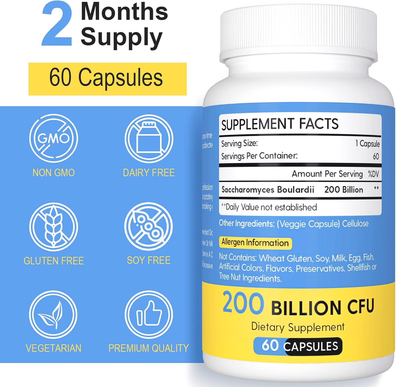 Saccharomyces Boulardii Probiotics 200 Billion CFUs, Clinically-Studied Probiotic for Women & Men Yeast for Intestinal, Gut, Immune & Digestive Health, Acid Resistant & Shelf-Stable, 60 Days Supply