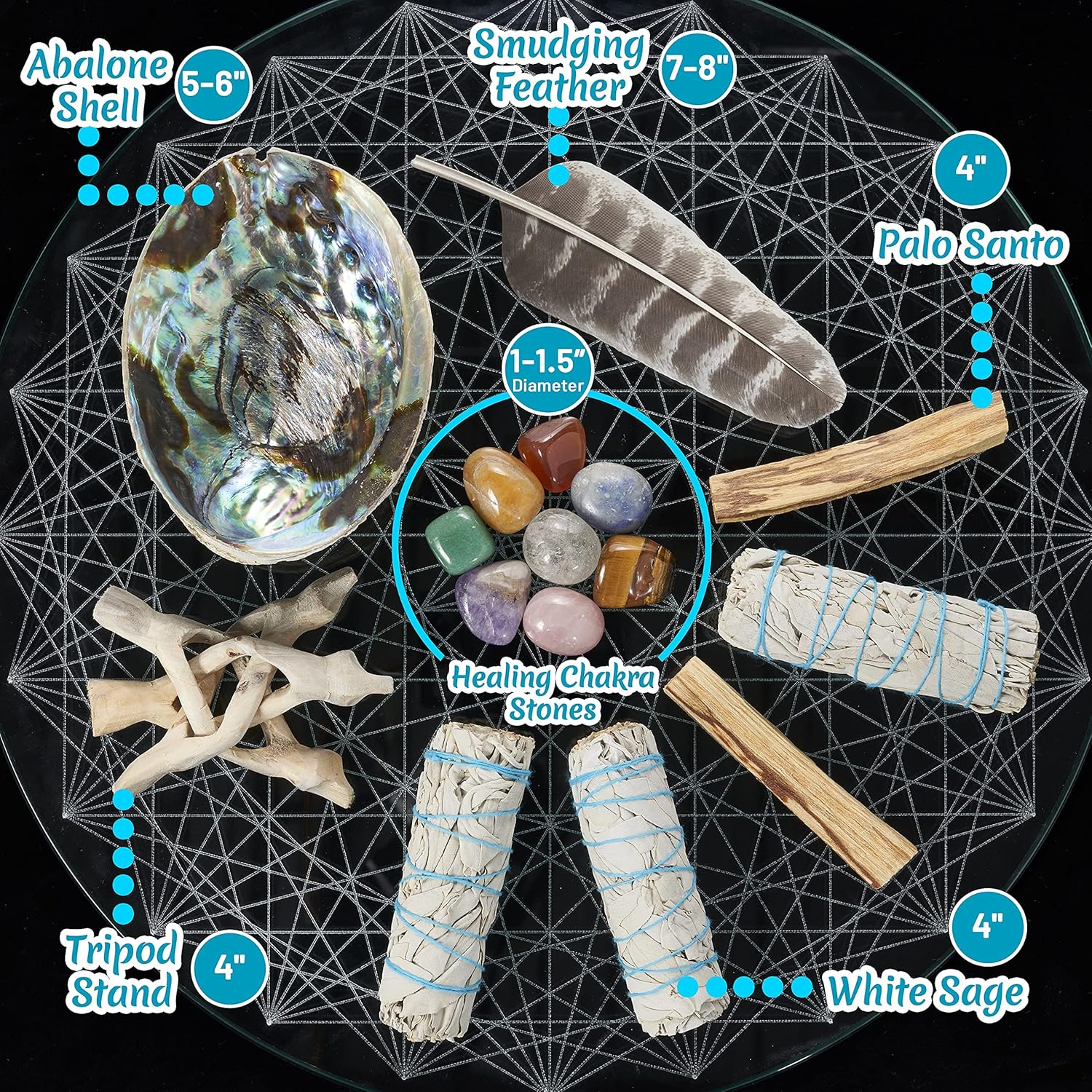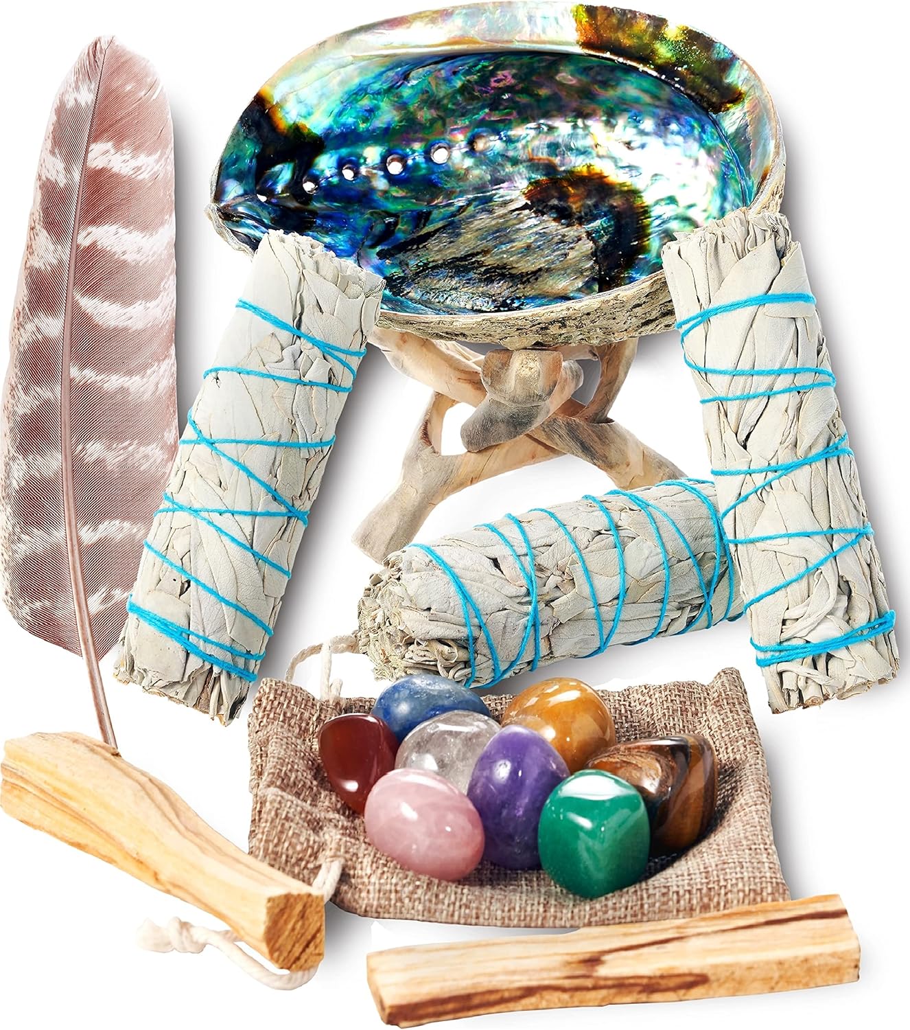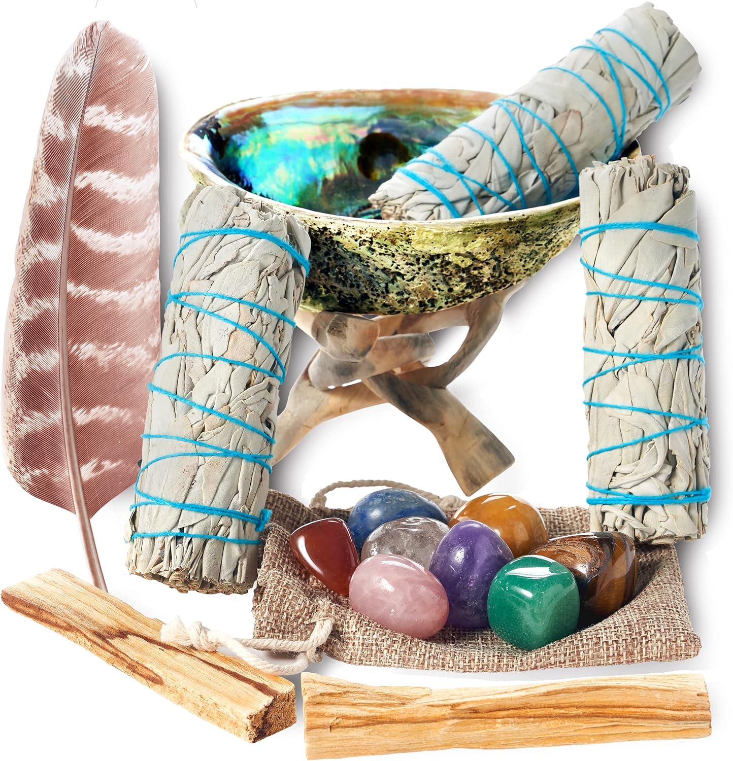 3 white sage smudge sticks (4 inch each)2 palo santo sticks (4 inch)1 abalone shell (5 to 6 inches wide)1 wooden tripod stand (4 inch + hand-carved)8 healing chakra stones (~1 inch each)1 smudging feather (8 inch)Easy step-by-step instructions & blessingsClean & stylish packaging ready for delivery