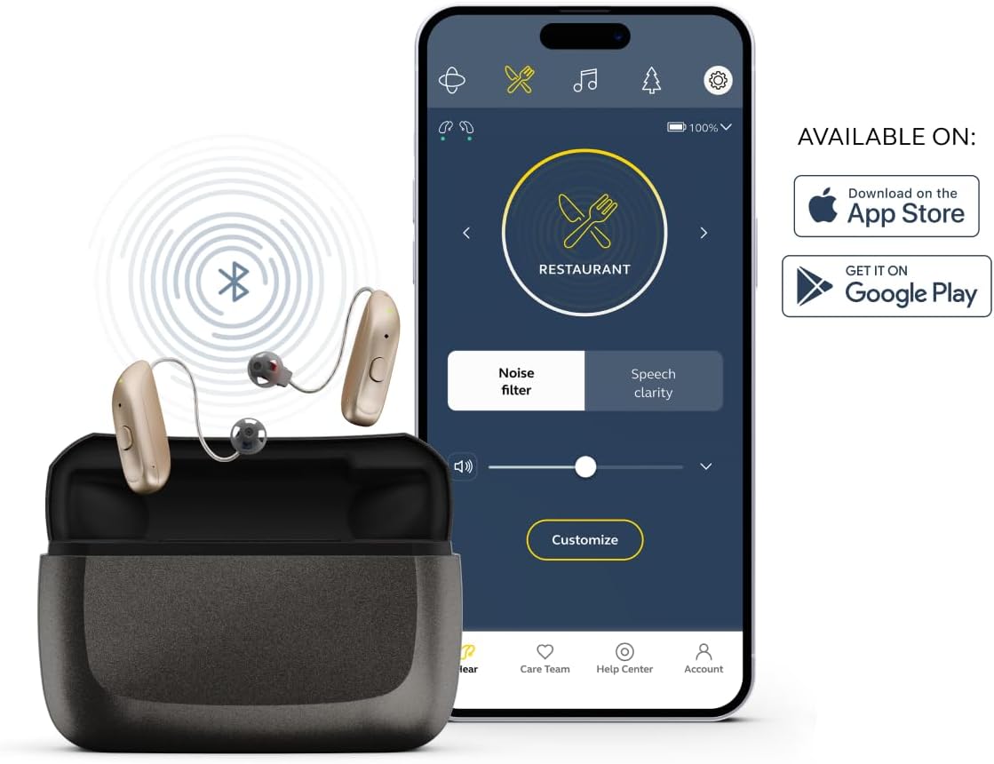 Select 300 OTC Hearing Aids, Audiology Team Care Included, Bluetooth Streaming for Calls, Music, Media for iOS & Android, Nearly Invisible & Comfortable, Noise Reduction – Gold