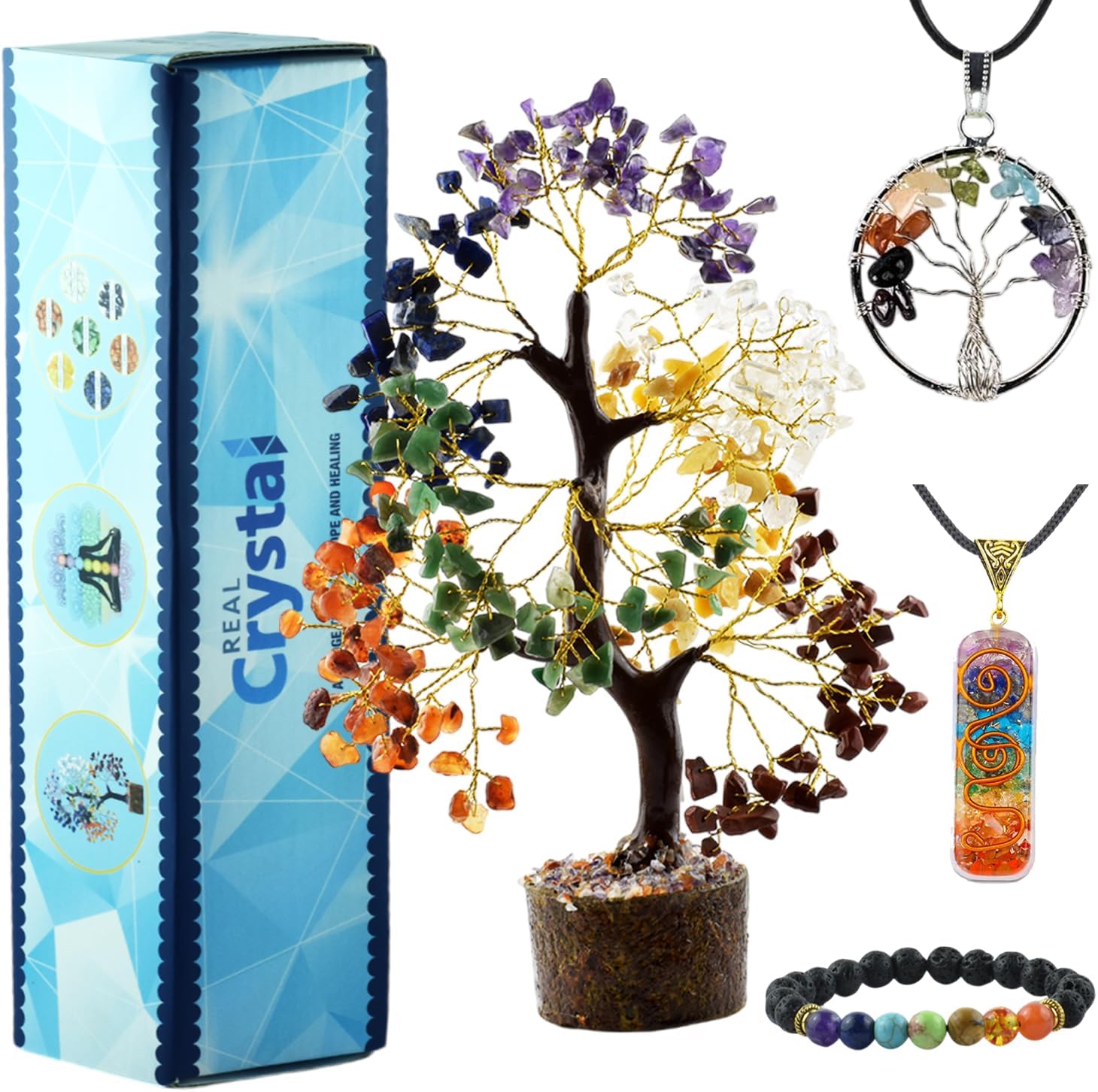Seven Chakra Healing Crystal Tree Kit with 7 Chakra Bracelet and 2 Pendant Necklace – Gemstones Money Bonsai Tree Decor for Spiritual Good Luck Gift, Birthday Gift for Women, Men, Home, Office