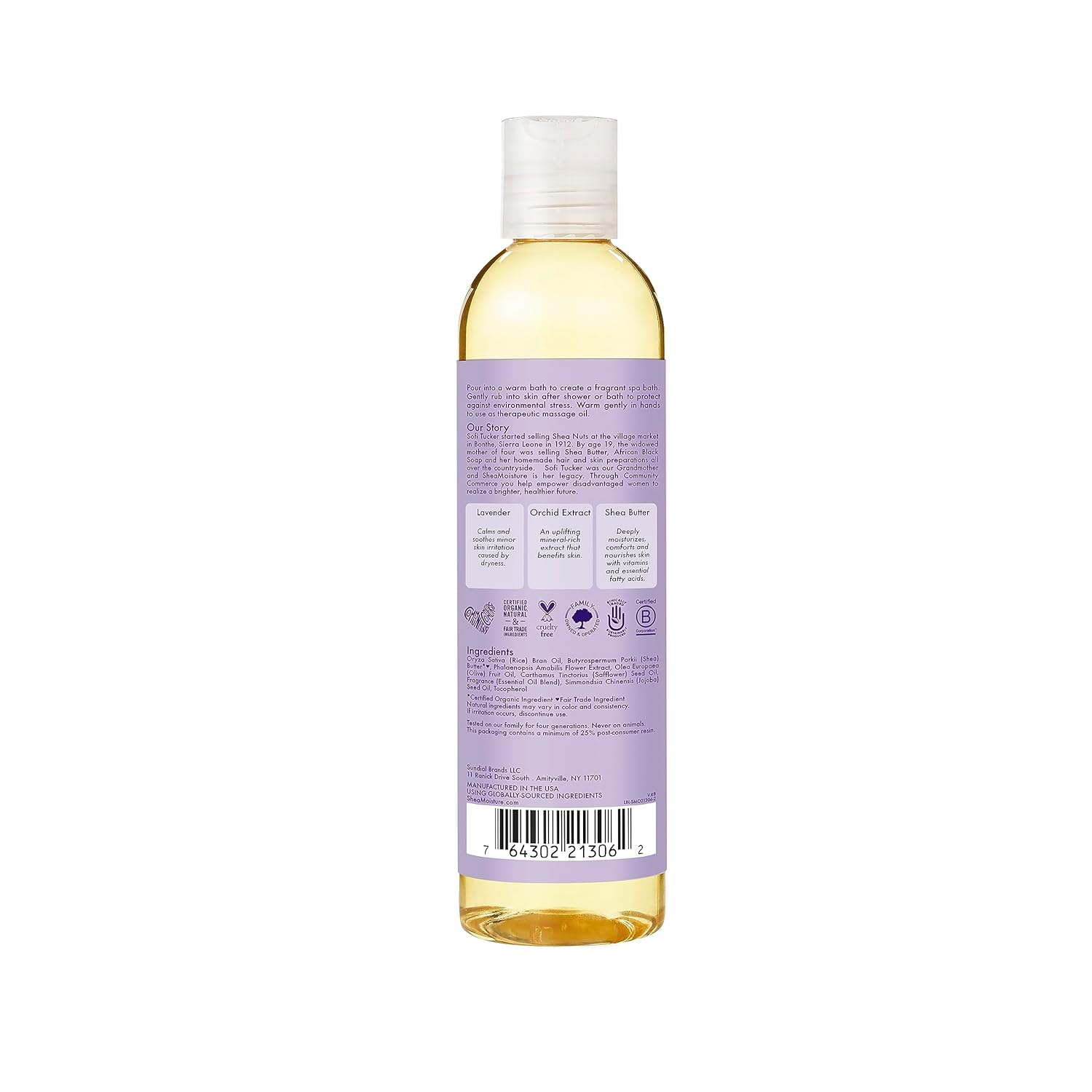 SheaMoisture Lavender & Wild Orchid Calming Bath, Body & Massage Oil is a skin moisturizer and sensitive skin lotion infused with Wild Orchid Extract to hydrate and leave skin lightly fragranced. This massage lotion, hand cream and all-over moisturizer is a massage oil for dry skin and sensitive skin. This is one of SheaMoisture’s best body lotions to relax the mind and body. Use this dry skin moisturizer by SheaMoisture to create a fragrant bath by pouring into your bath. Gently rub this moisturizer into skin after shower or bath. Warm in hands for hand therapy and as a therapeutic massage oil. You’ll love this lavender lotion and hand cream for sensitive skin by SheaMoisture that’s carefully formulated with no parabens, no phthalates, no mineral oil and no sulfates. Known to hydrate as a body lotion, hand cream and food lotion, thanks to SheaMoisture’s Fair Trade Certified Organic Shea Butter and moisture-rich oils found in this moisturizer. This paraben-free moisturizer and lavender lotion is a cruelty-free dry skin moisturizer that has been tested on our family for generations and never on animals. SheaMoisture’s Story: SheaMoisture is the legacy of Sofi Tucker, a pioneering mother of four and an entrepreneur, who sold Shea Butter, African Black Soap and homemade beauty preparations in Sierra Leone in 1912. We honor her vision by continuing to formulate with Raw Shea Butter handcrafted by women in Africa. With every purchase, you show support of our mission to reinvest back in our communities. • Ethically traded ingredients sustainably produced. • Pioneering Community Commerce and Fair Trade since 1912. • Tested on the Tucker family for four generations. Never on animals.