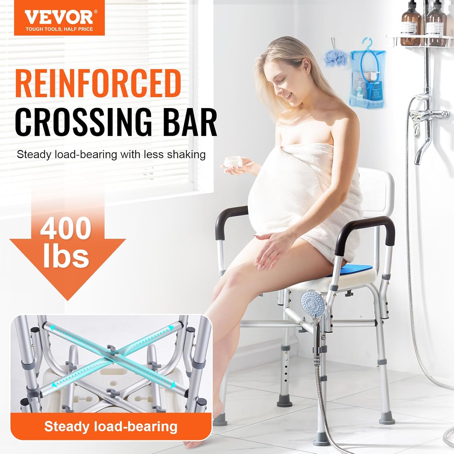 Shower Chair Seat, 400 lbs Capacity, Shower Stool with Crossing Bar, Padded Armrests and Back, Shower Chair for Inside Shower Bathtub, Adjustable Height Bench Bath Chair for Elderly Disabled
