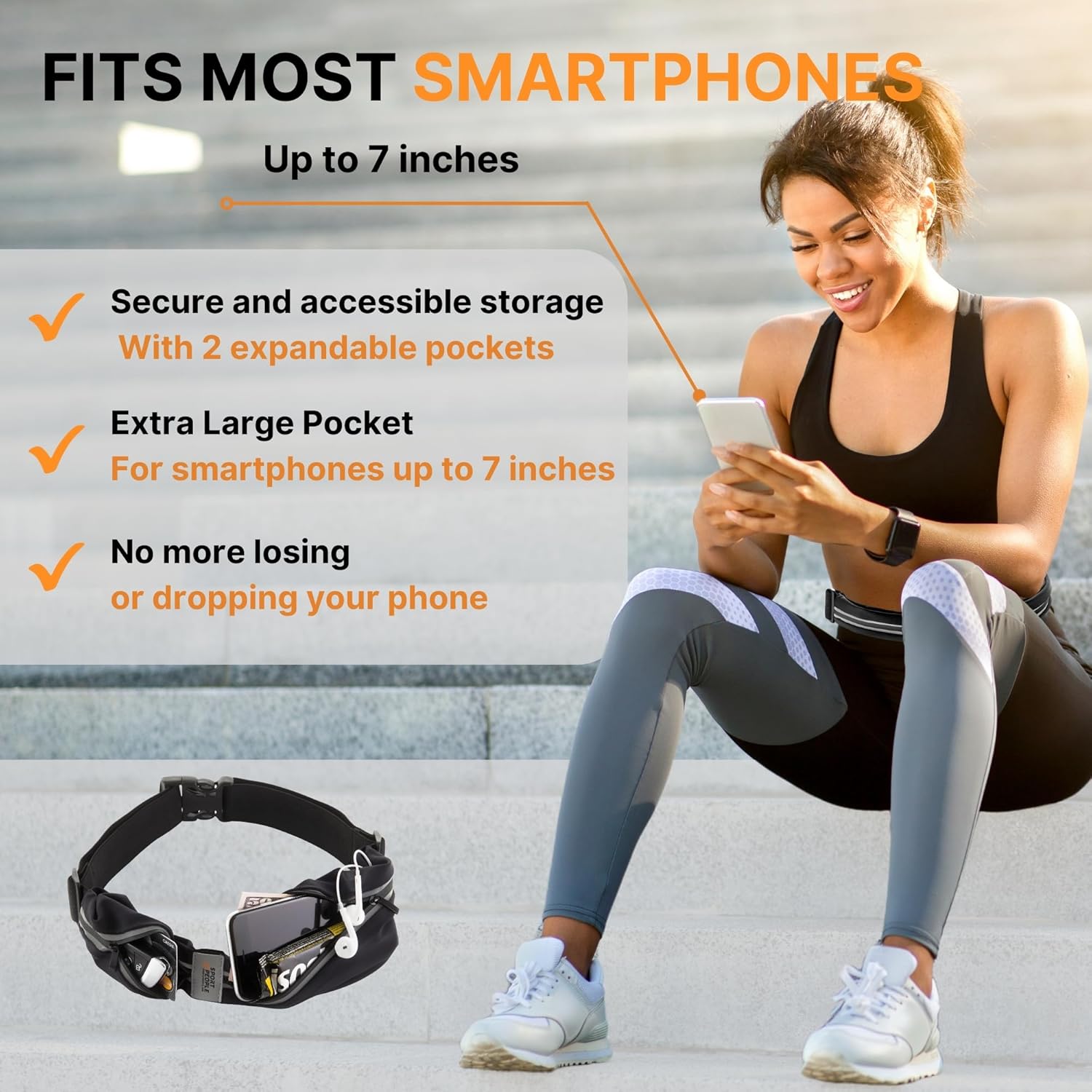 𝗙𝗿𝘂𝘀𝘁𝗿𝗮𝘁𝗲𝗱 𝘄𝗶𝘁𝗵 𝗯𝗼𝘂𝗻𝗰𝗶𝗻𝗴, 𝘀𝗹𝗶𝗽𝗽𝗶𝗻𝗴 𝗯𝗲𝗹𝘁𝘀? Say goodbye to distractions! Our secure, no-bounce running bag lets you focus on your run — no slipping, just pure freedom. The adjustable strap (26”-49”) molds perfectly to your body, so you can move freely.