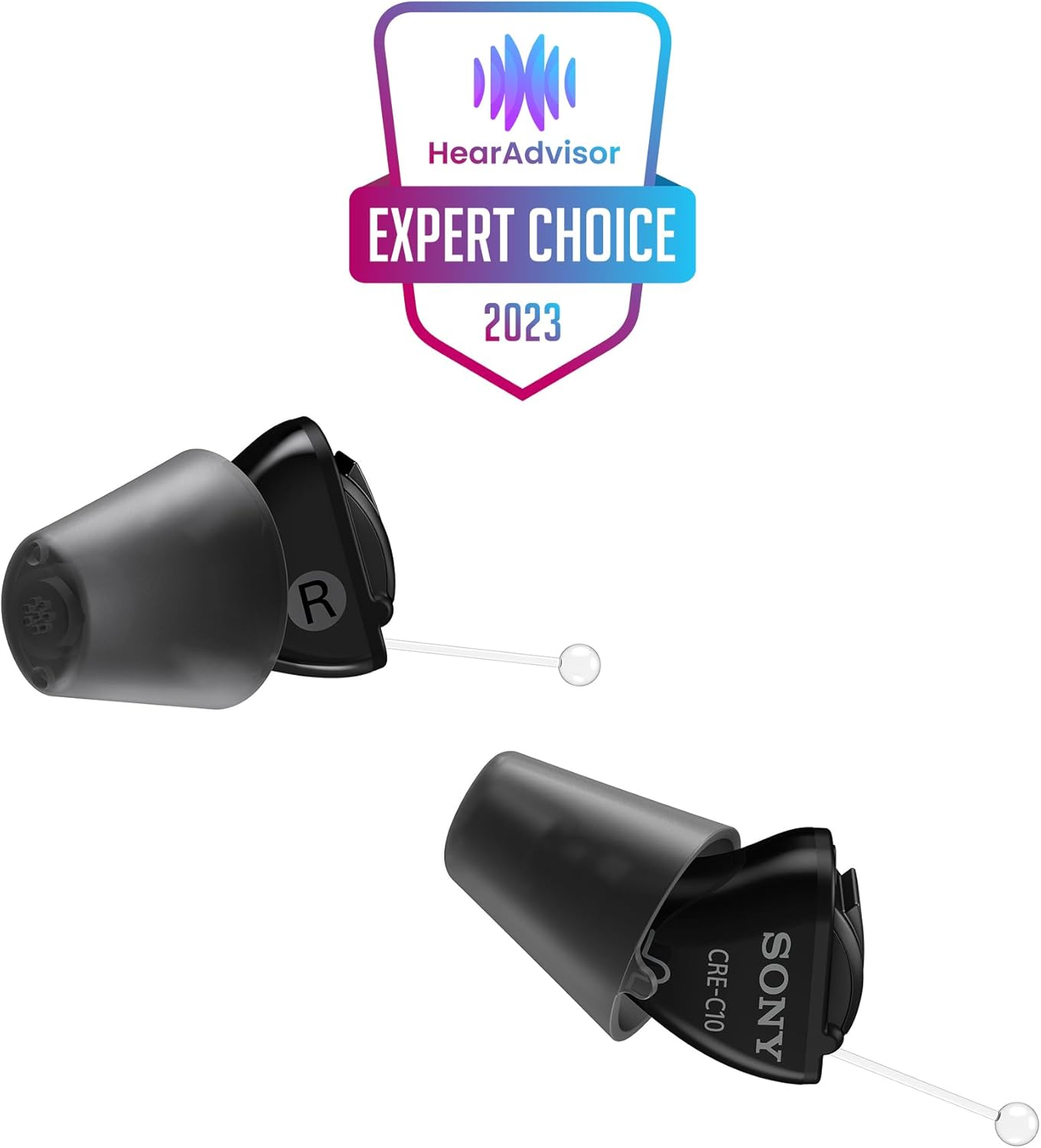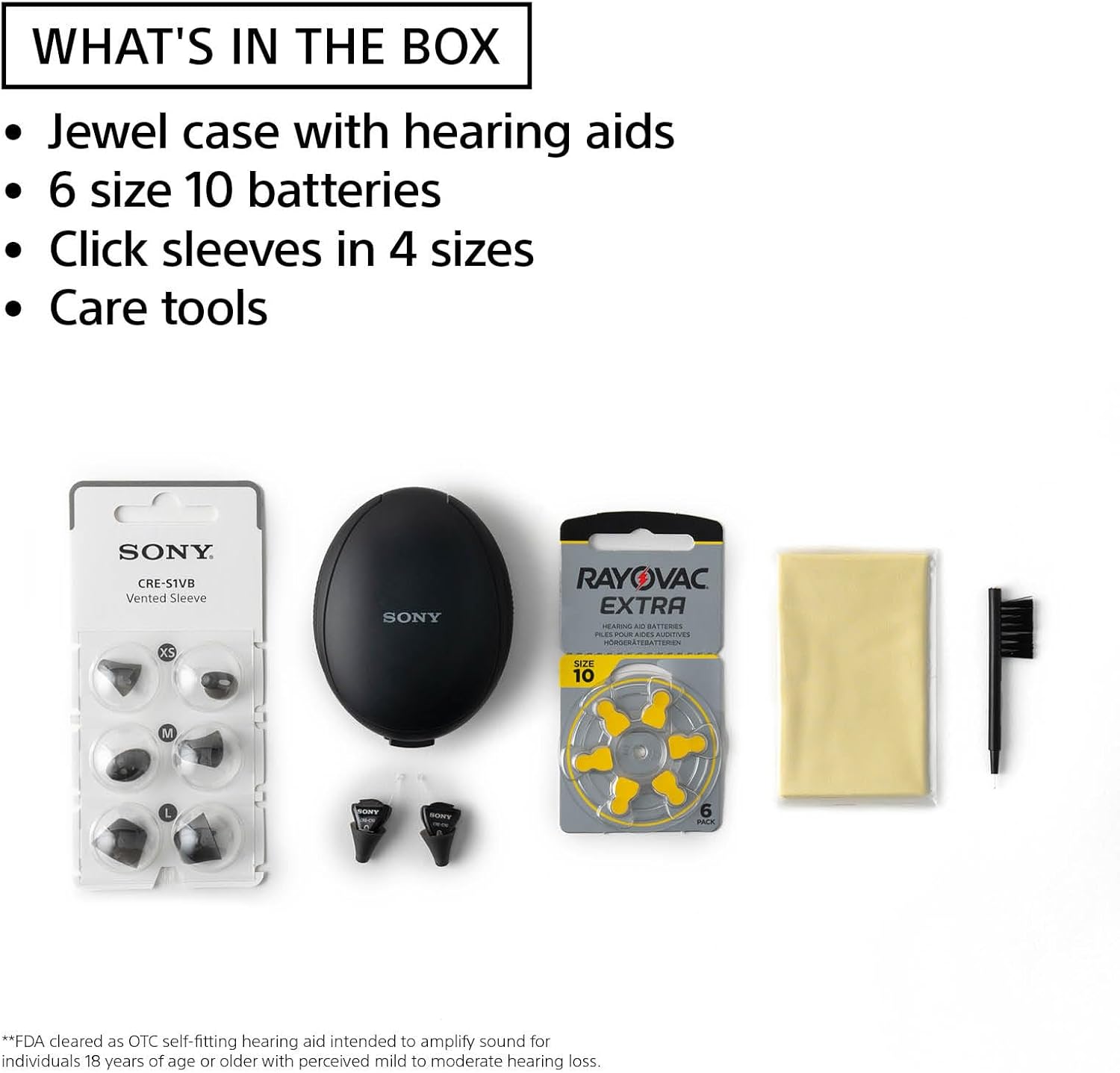 Sony CRE-C10 Self-Fitting OTC Hearing Aids for Mild to Moderate Hearing Loss, Prescription-Grade Sound Quality, Compact Virtually Invisible Design, Customizable App, and Replaceable Batteries, Black