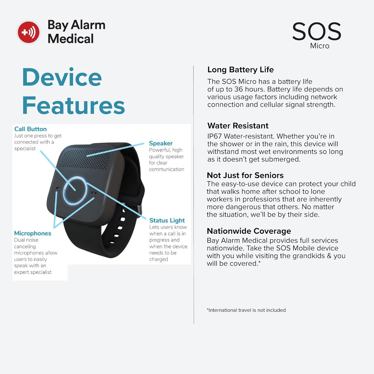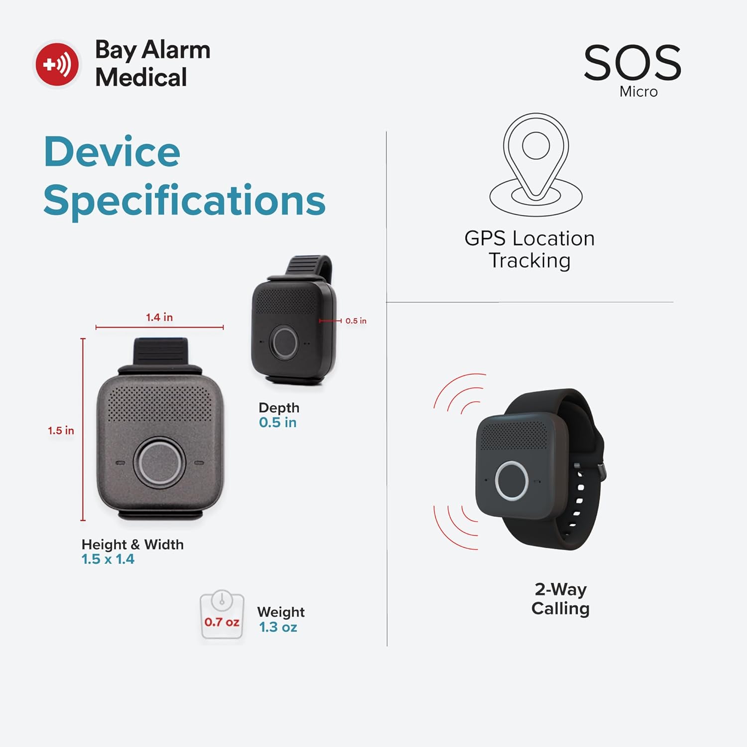 SLEEK & COMPACT: Weighing less than 1.2oz, the SOS Micro is a compact medical alert device that can be worn around your wrist, on your neck with a lanyard or on the included belt clip. It is IP-67 water resistant. So, whether you’re in the shower or in the rain, this device will withstand most wet environments so long as it doesn’t get submerged.