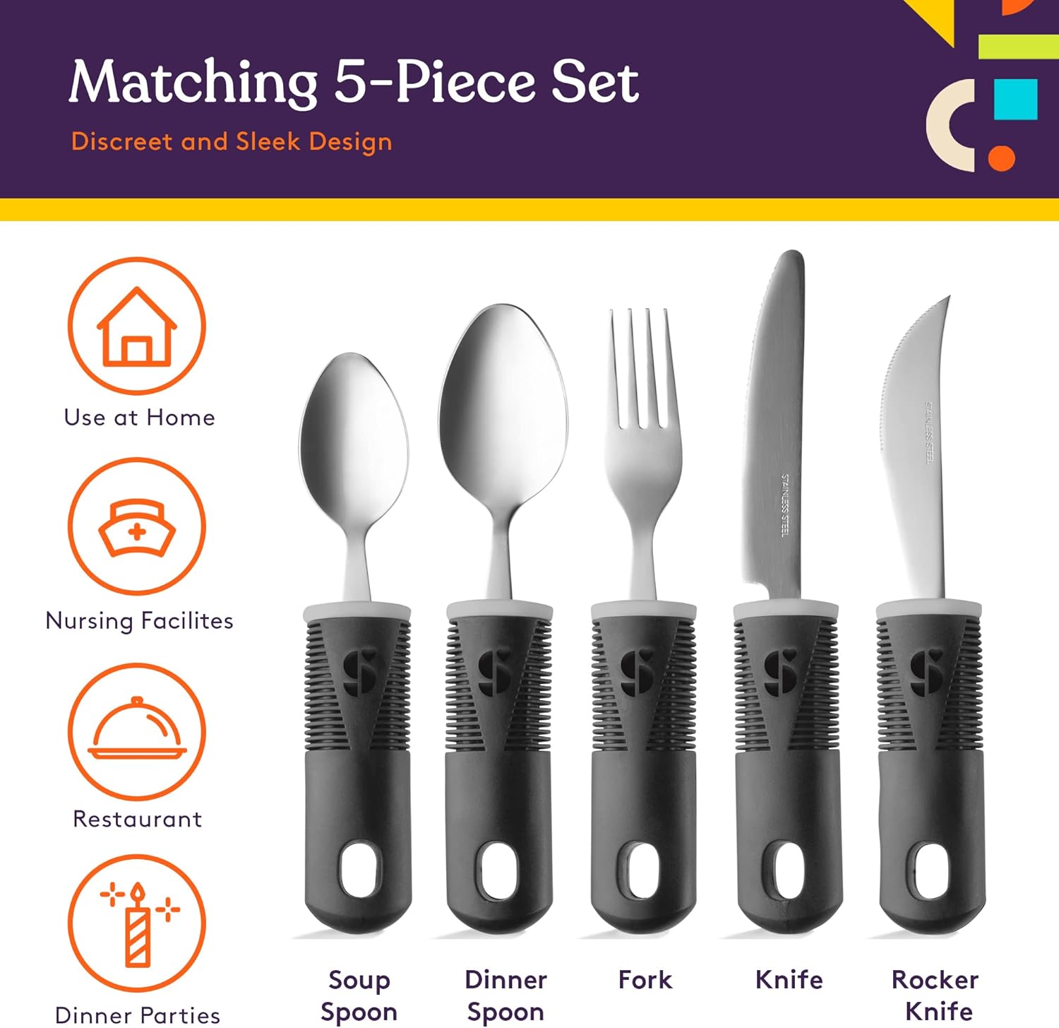 Matching 5-Piece Set – Every order comes with five unique eating utensils, including a fork, knife, curved knife, dinner spoon and soup spoon to cover a wide range of meal choices.