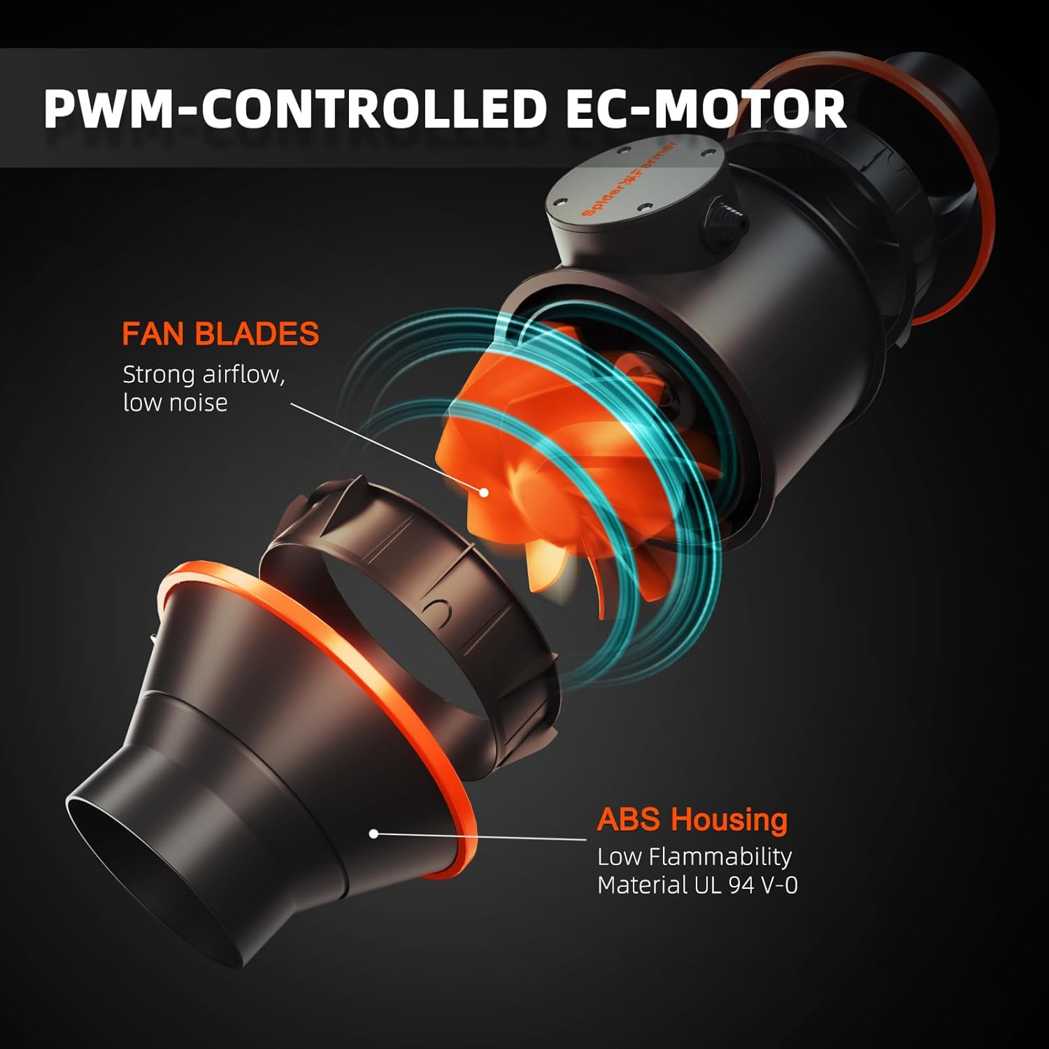 Powerful Ventilation System: Quiet and low noise (26.8 dB) 4” Inline fan 205 CFM airflow with RC412 activated carbon filter and flexible duct. Provides excellent air circulation and eliminates odors. Clip fan delivers airflow ranging from 0 to 2500 RPM, flexible rotation quick circulation cooling, and customizable 10 speeds for all plant growth stages.