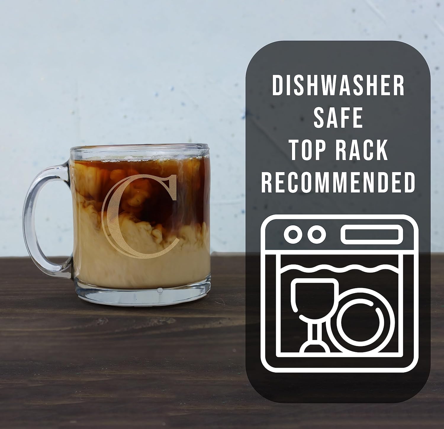 I needed a mug to replace one that I had. I searched for a sturdy clear mug that was made in the USA. This one fit the bill… didn’t really need a monogram, but could not find a mug that specifically indicated the country of origin. The monogram is a nice touch and is well done on the glass surface. I am happy.