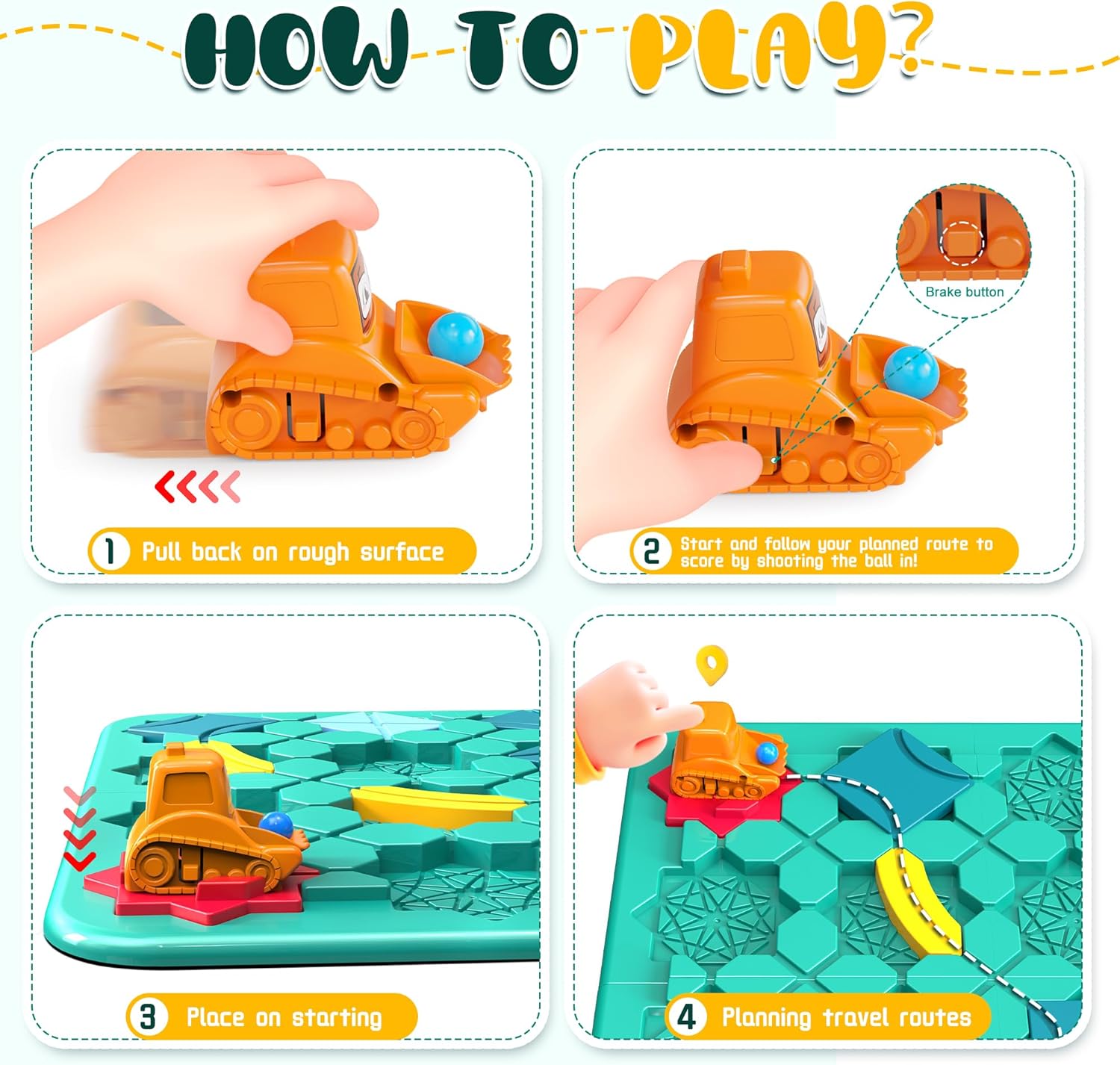 【Developing Thinking Skills】 Design a route on the baseboard, use different types of pieces to build a trail, and ensure it connects from the starting point to the end. Then, guide the car along this trail and successfully transport the marble to the destination. Through hands-on activities and problem-solving challenges, cultivate children’s thinking abilities