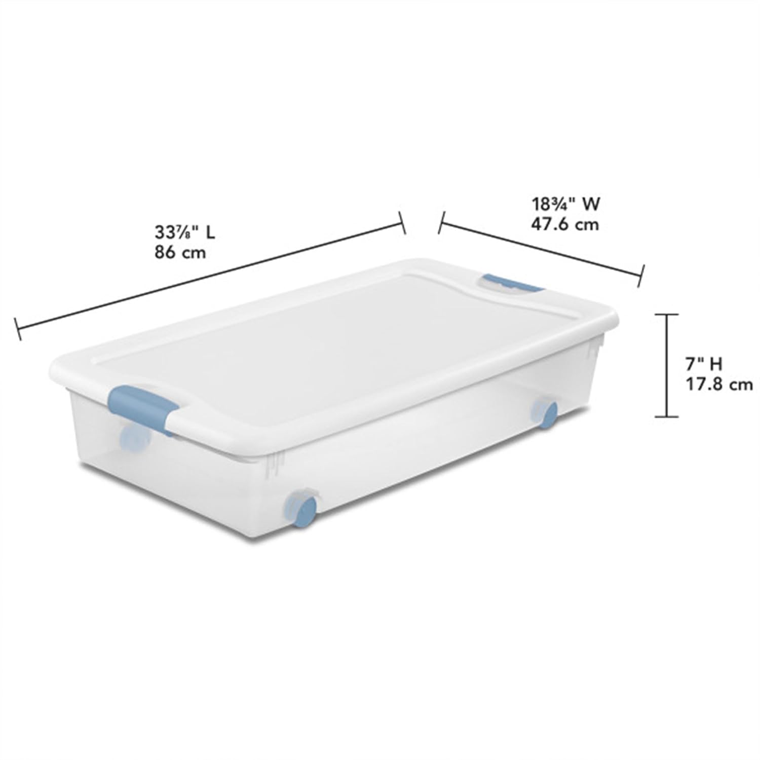These four Under Bed Latching Boxes are very well designed and made… the lids fix perfectly, are tight and seal well. The clear plastic makes it easy to look through in order to find what you need….Thee wheels are a great addition and help move the boxes around and store them easily under the bed or in the closet… Those were the PROS… THE CONS – They came in a large not too sturdy cardboard box which was not well sealed… the masking tape that was used was coming off when delivered… luckily they didn’t fall off … my personal suggestion is to make sure that the box is sealed tightly before sending them out for delivery… I do however highly recommend these products….