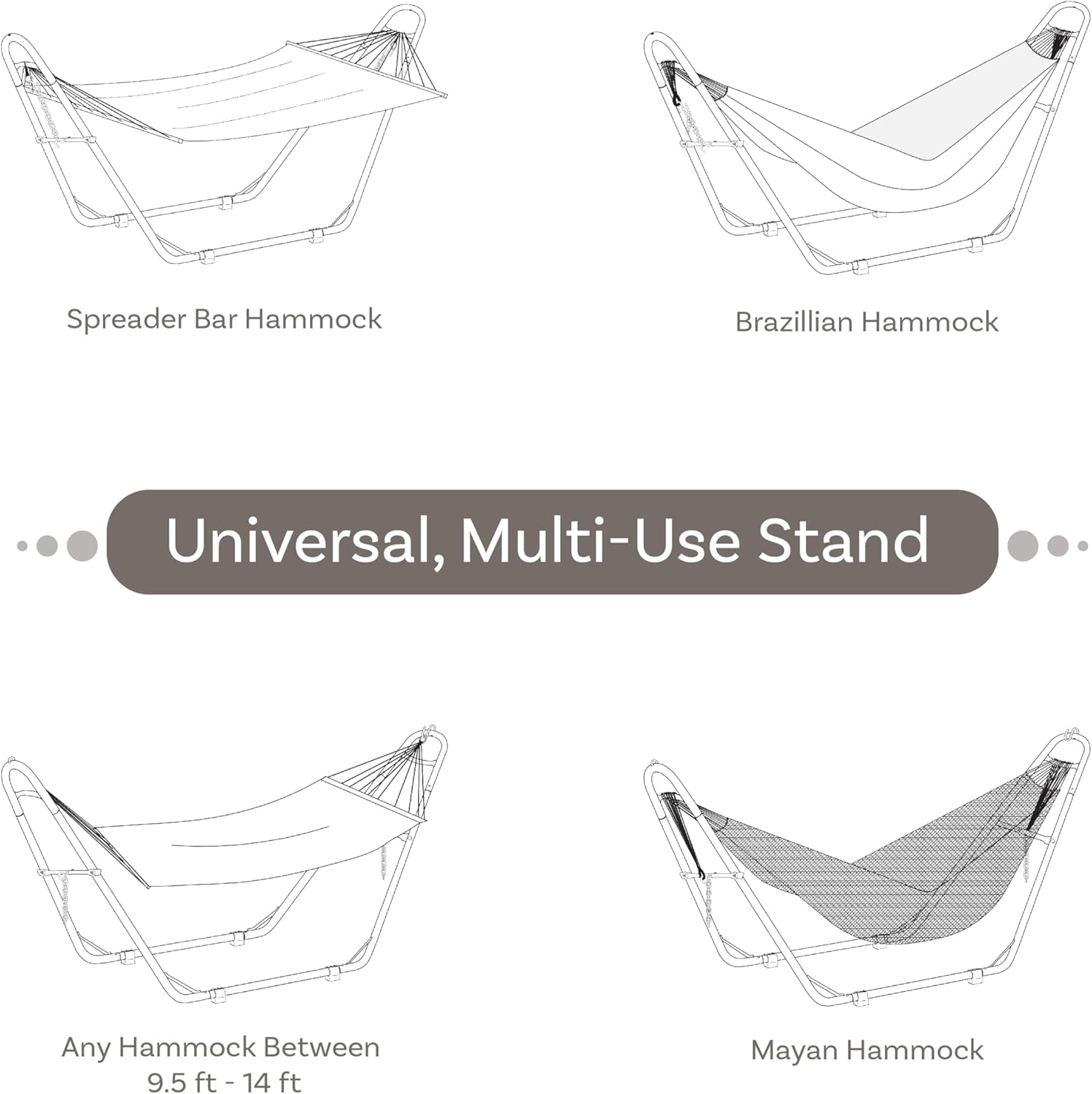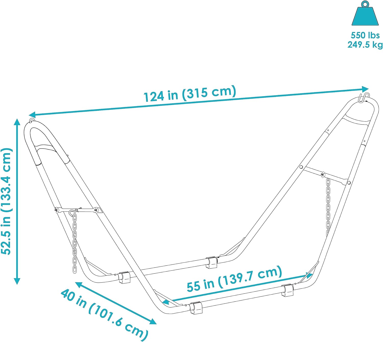 ACCOMMODATES A VARIETY OF HAMMOCKS: The adjustable hammock stand measures 124″ W x 40″ D x 52.5″ H. The base bars are 55″ L. With the included chains and hardware, this stand will fit small to large hammocks, including Mayan, Brazilian, camping, or spreader bar style, ranging from 9.5′ to 14′ long. The hammock stand can support up to 550 lbs and weighs approximately 33 lbs.
