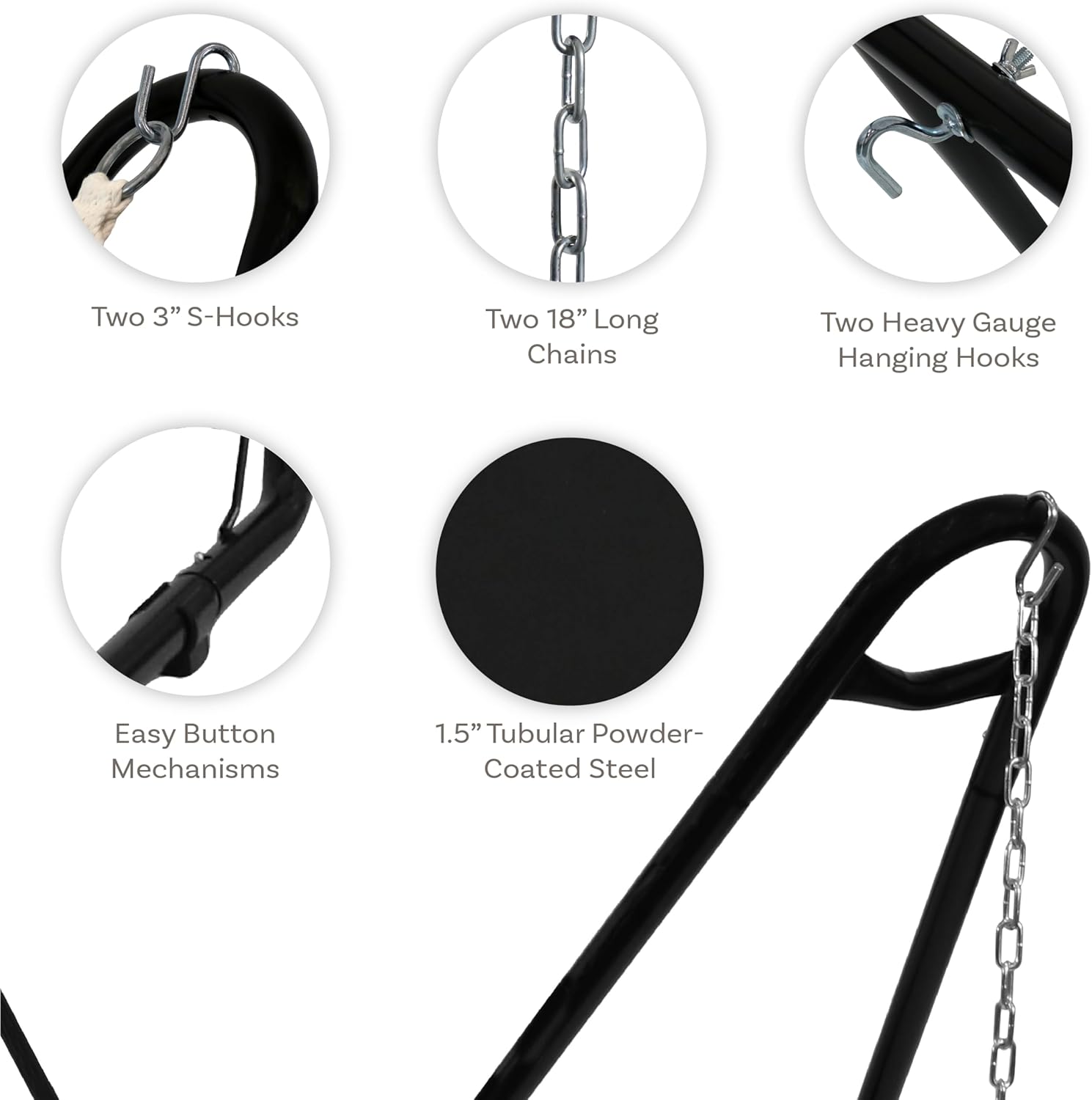EFFORTLESS ASSEMBLY: This outdoor hammock stand includes two 3″ S-hooks, two heavy-gauge hanging hooks, four plastic feet, and two 18″ chains to make it easily adjustable to any desired length. Assembly is easy and requires no special tools. All joints lock together with easy spring-snap button mechanisms.