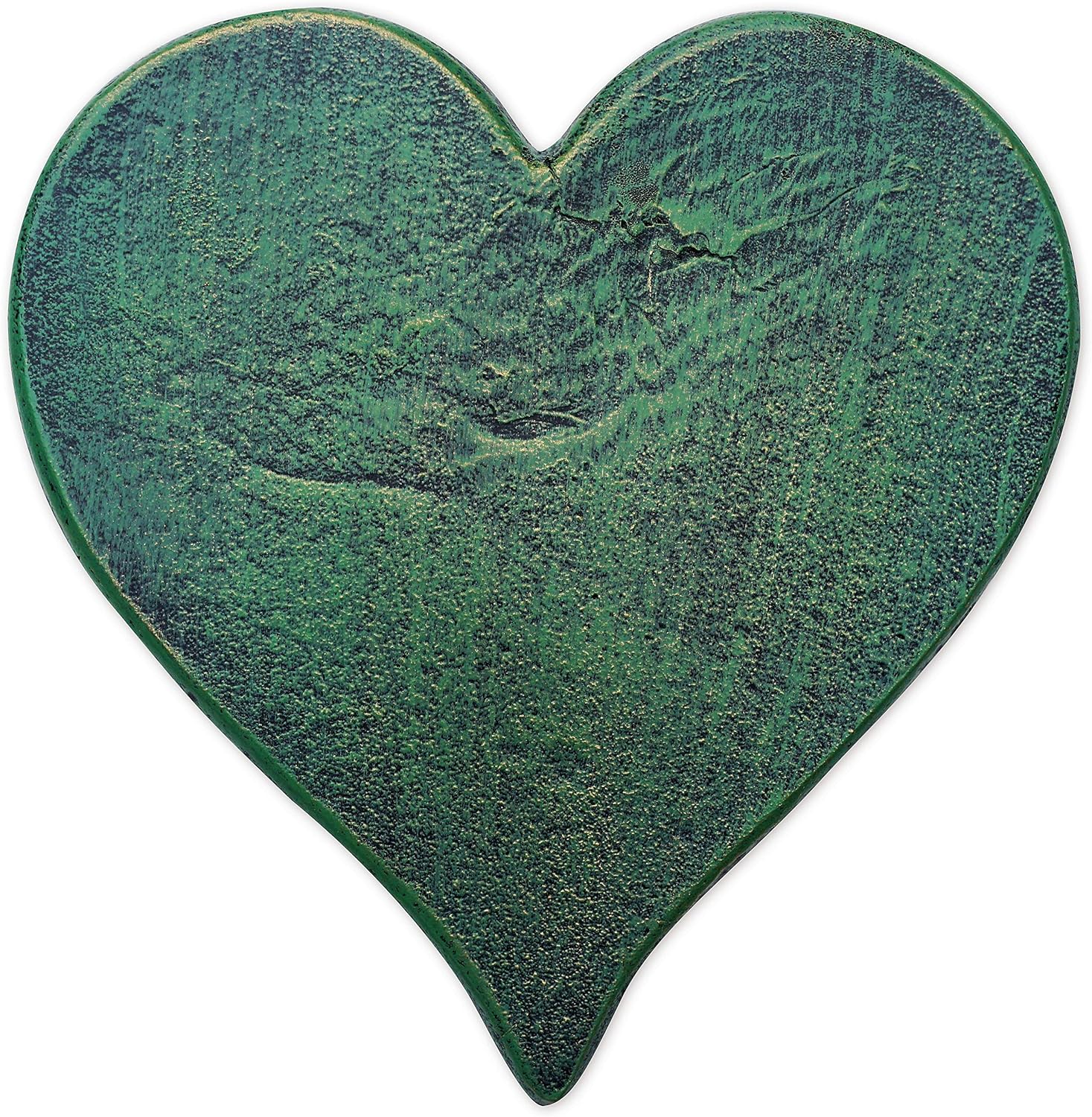 HAND CRAFTED STEPPING STONE: Heart-shaped stepping stone with a classic distressed verdigris finish for an aged outdoor look and feel