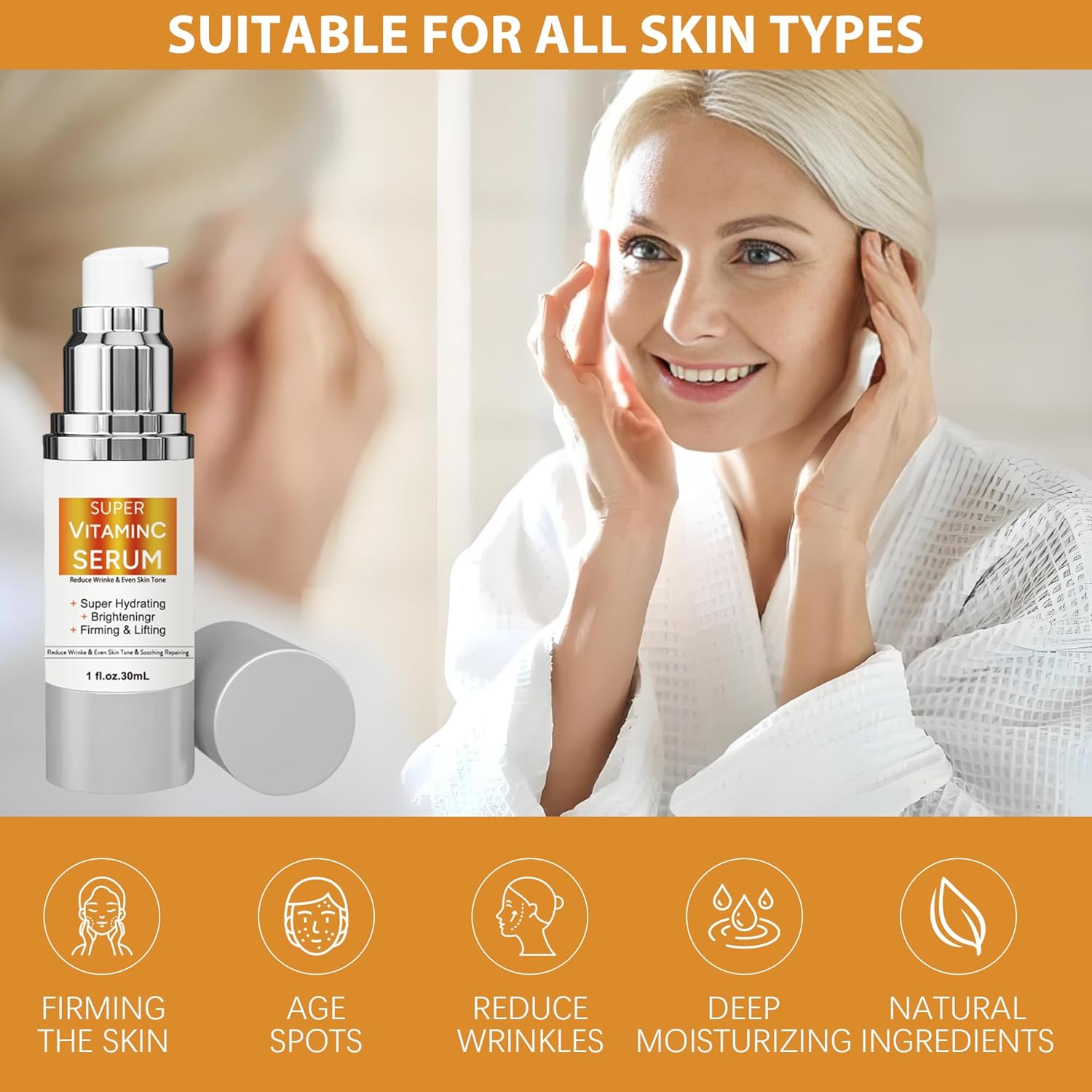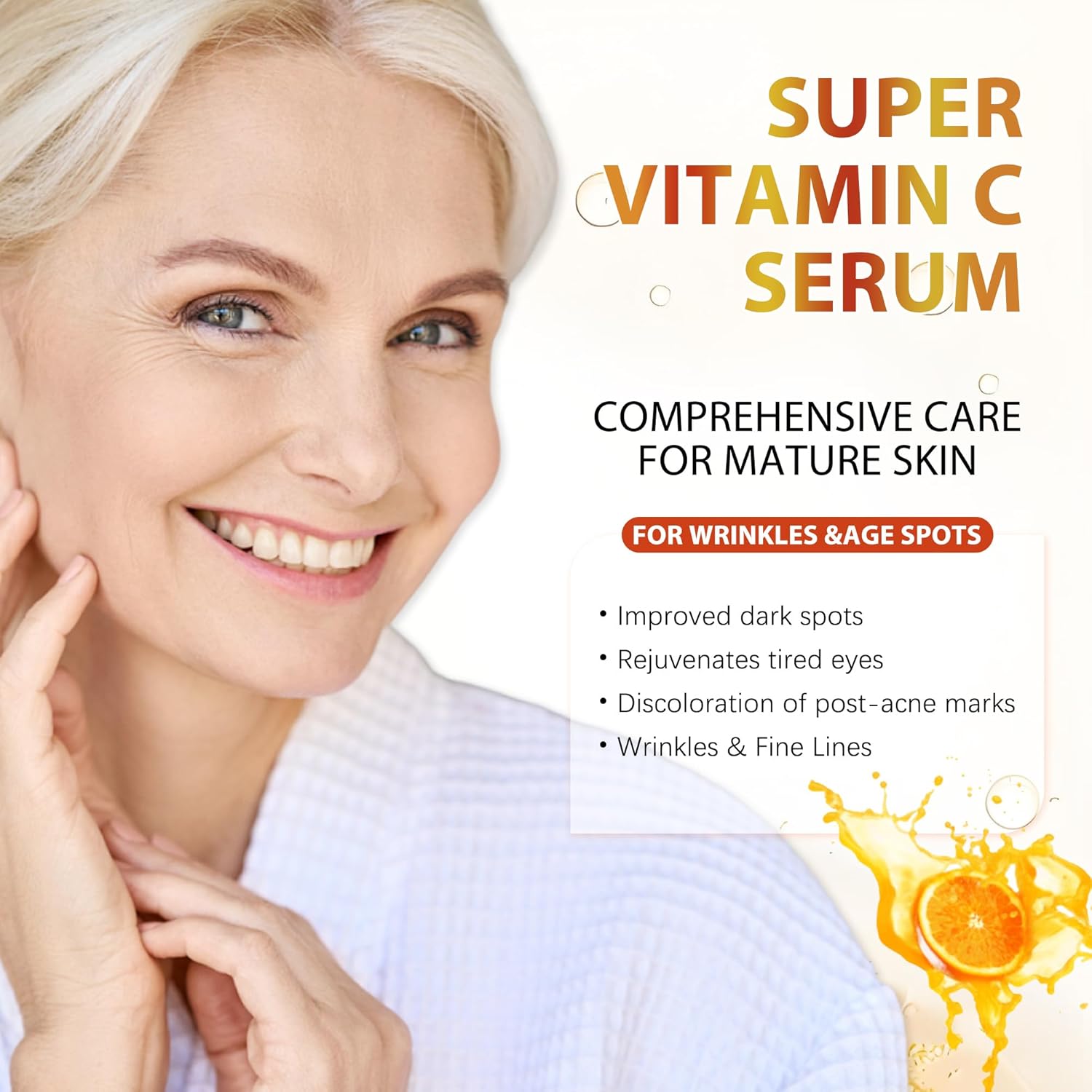 Age-Defying Powerhouse: Specifically formulated for mature skin over 40,50,60,70, our serum combines Vitamin C, Niacinamide, Vitamin E, and Caffeine to target wrinkles, fine lines, and dark spots. Restore firmness, lift sagging skin, and reveal a radiant, youthful glow with this all-in-one anti-aging solution.