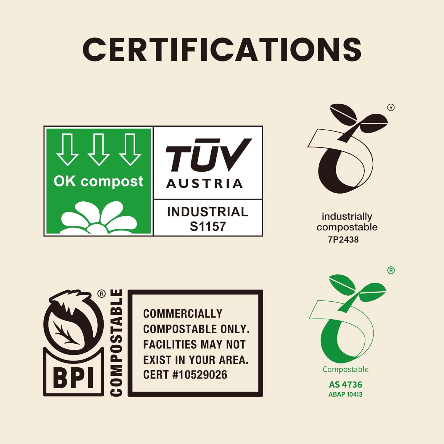 CERTIFICATIONS: SUPERBIO bags has been awarded official certificates from Biodegradable Products Institute (BPI) (Commercially Compostable Only) and OK compost INDUSTRIAL, SEEDLING from TUV, meeting both the ASTM D6400 standard and the EN 13432 standard