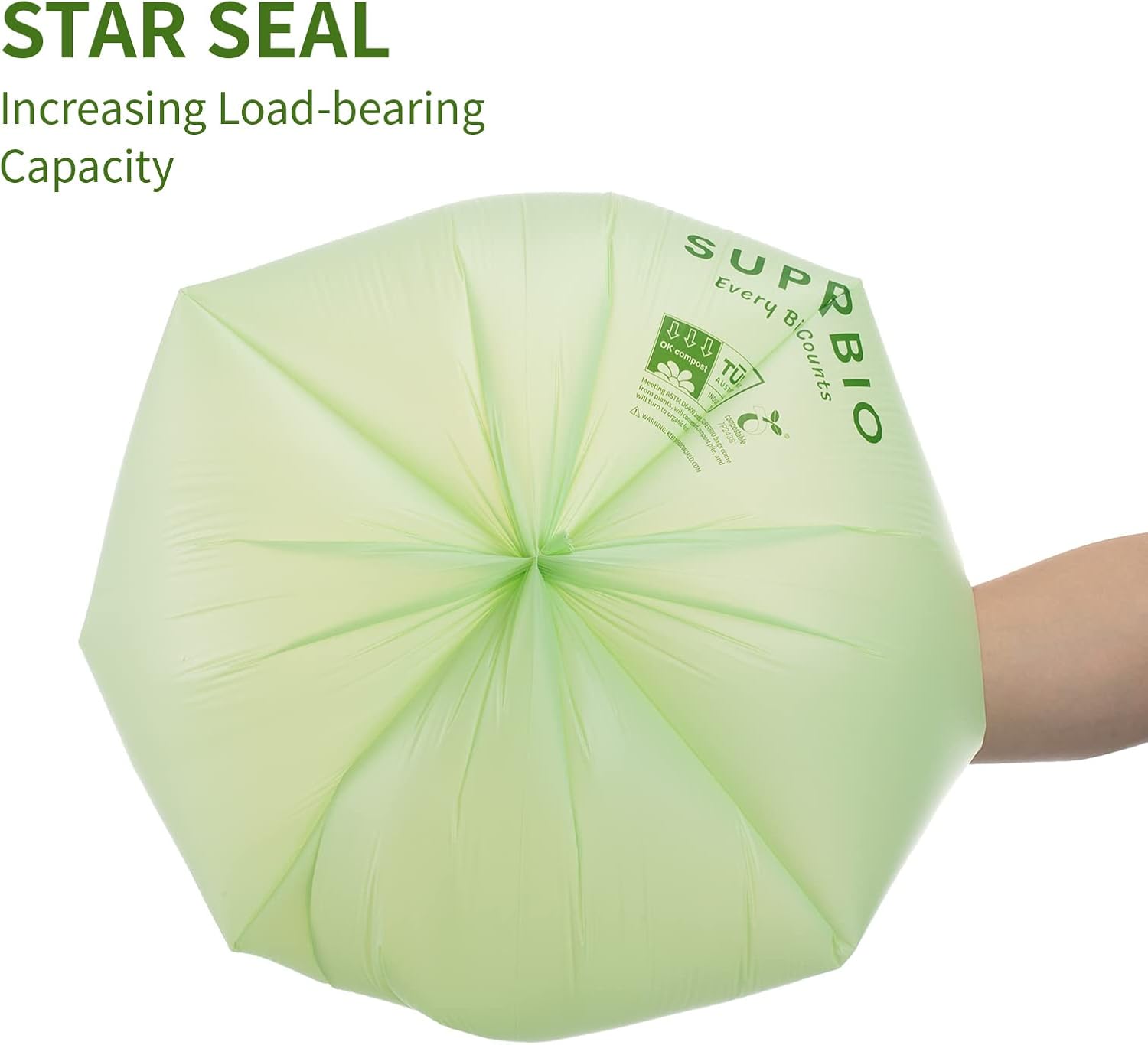 PRODUCT FEATURES: SUPERBIO bags are guaranteed to remain strong, sturdy and tear proof when used in accordance with the recommended usage directions. Patented processing technologies. Handle tie and star sealed reinforced bottom to securely hold even the heavy load
