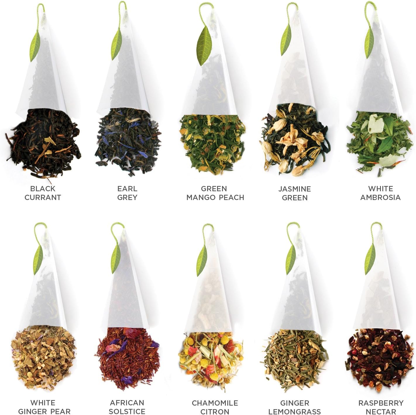 TEA TASTING ASSORTMENT – 20 pyramid infusers, two of each blend – 4 Herbal Tea blends, 2 Black Tea blends, 2 Green Tea blends, and 2 White Tea blends.