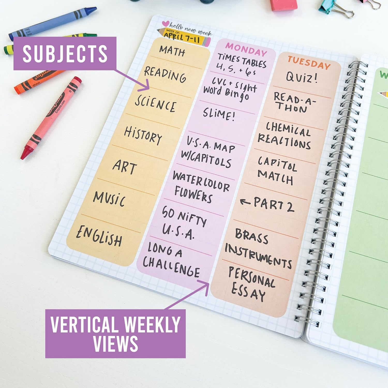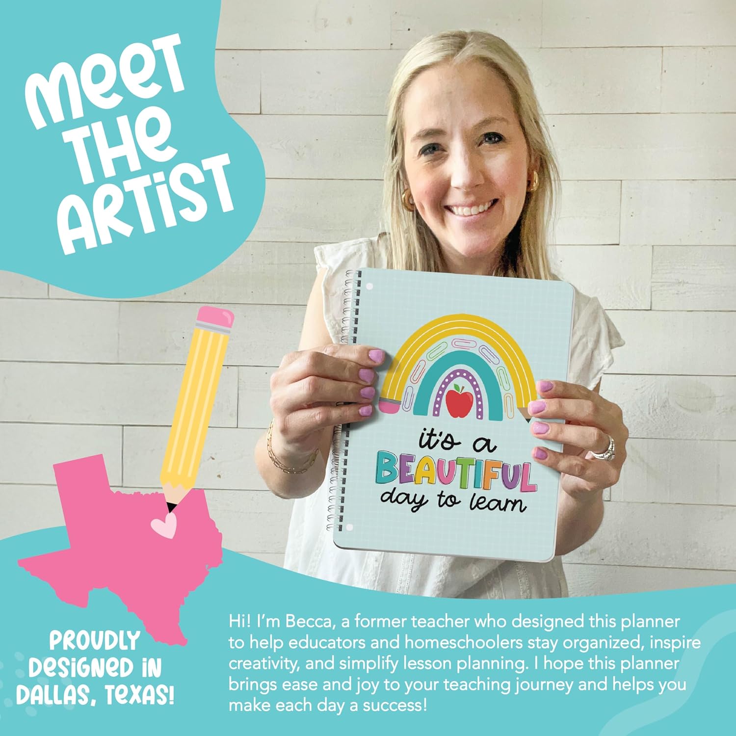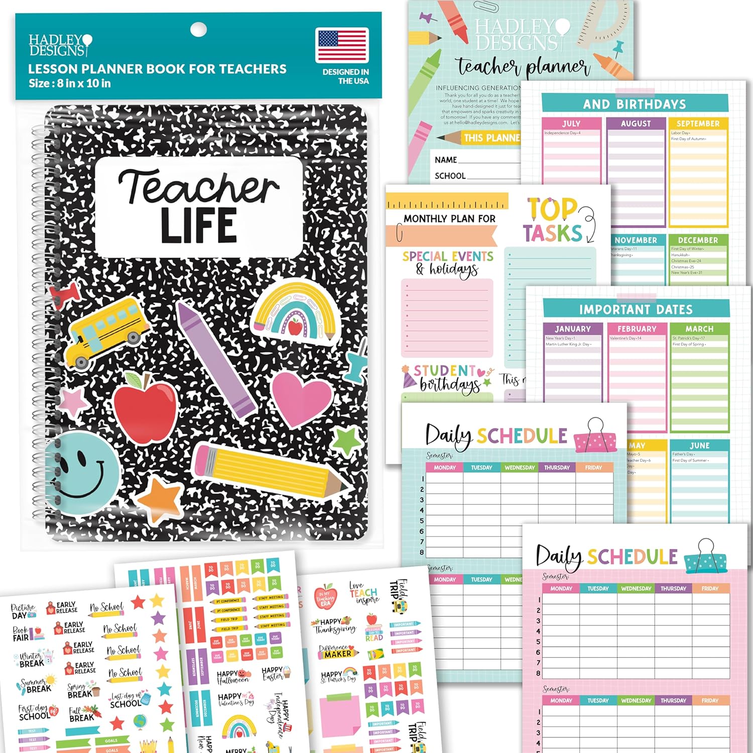Stay Organized In Style; You’ll receive an 8×10 inch teacher planner with 12 undated monthly sections, each with space for five weekly plans per month, plus 3 sticker sheets, 1 substitute sheet, 1 field trip planner, 2 daily schedules, 2 student info sheets, 2 important dates sheets, 1 year review