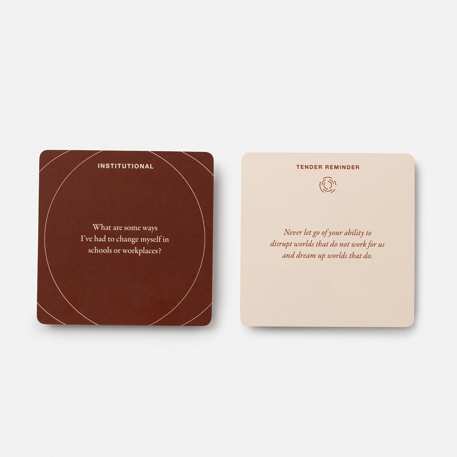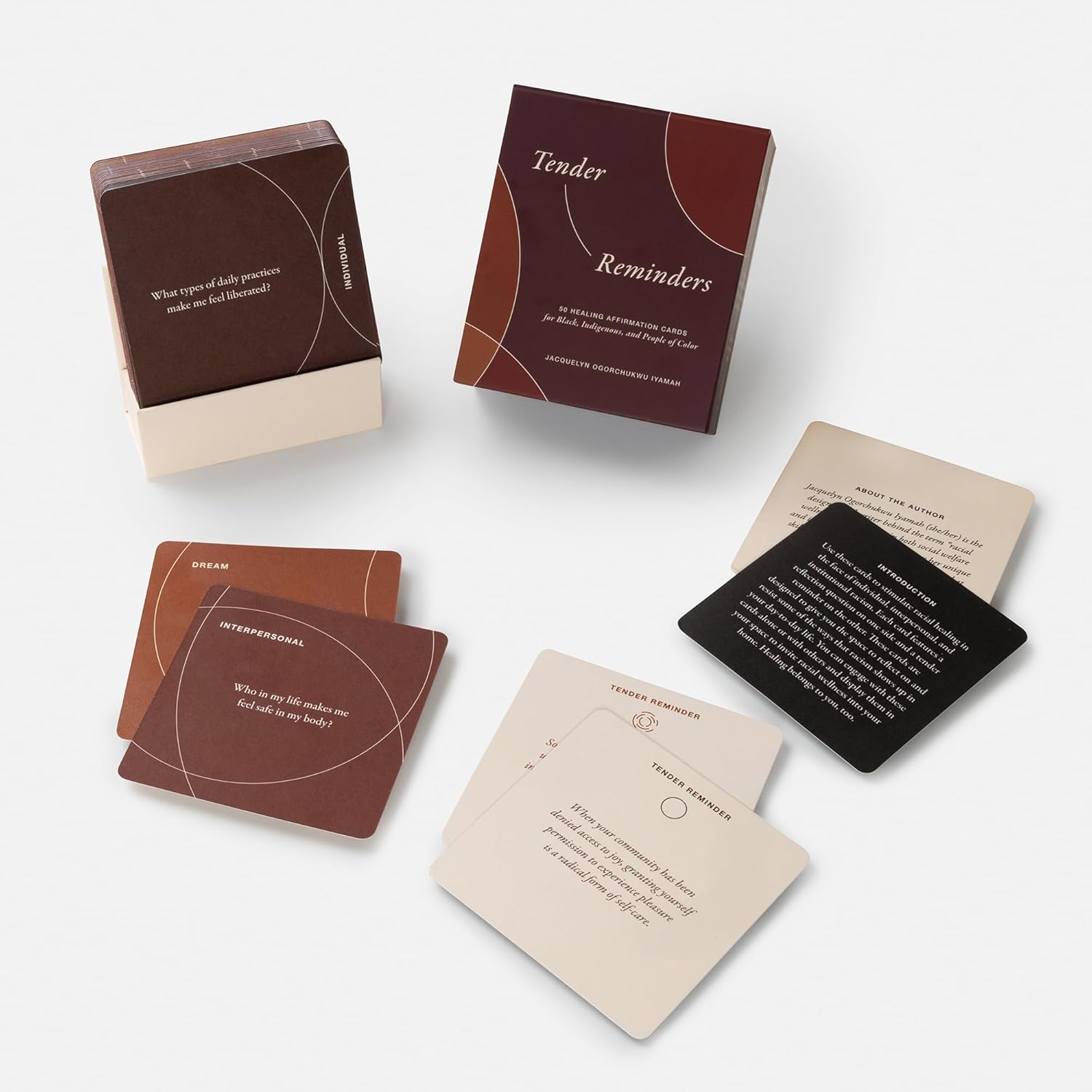 From racial wellness visionary Jacquelyn Ogorchukwu Iyamah, these fifty cards give Black, Indigenous, and People of Color the rare opportunity to experience revolutionary healing in the face of systemic racism. This powerful deck features tender reminders on one side and thoughtful questions on the other, offering compassion and validation while allowing you to reflect on your unique experiences and resist some of the ways that racism shows up in your life. Whether you’re displaying these affirmations in your home or adding the reflection questions to your journaling or meditation practice, Tender Reminders is a space for you to pour back into yourself and grant yourself the tenderness you deserve.