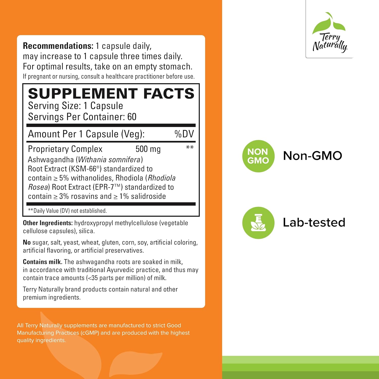 Terry Naturally Adaptra – Supplement to Support Adrenal Health – Ashwagandha Supplement with Rhodiola Rosea Extract – Herbal Supplement to Support Energy & Concentration – 60 Capsules (Pack of 2)