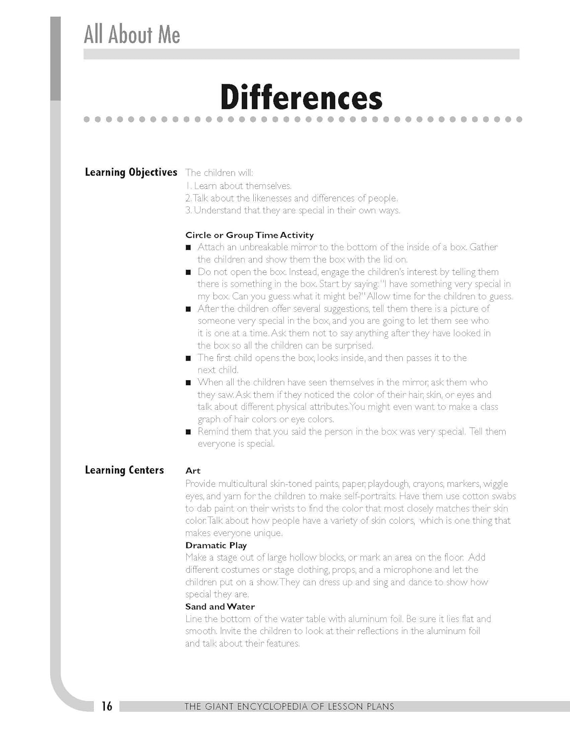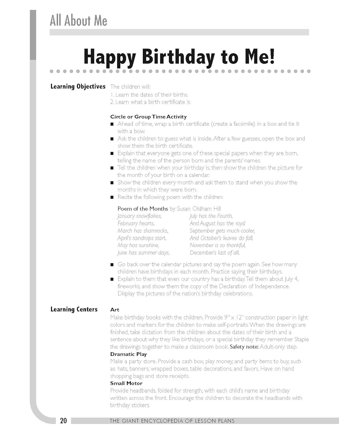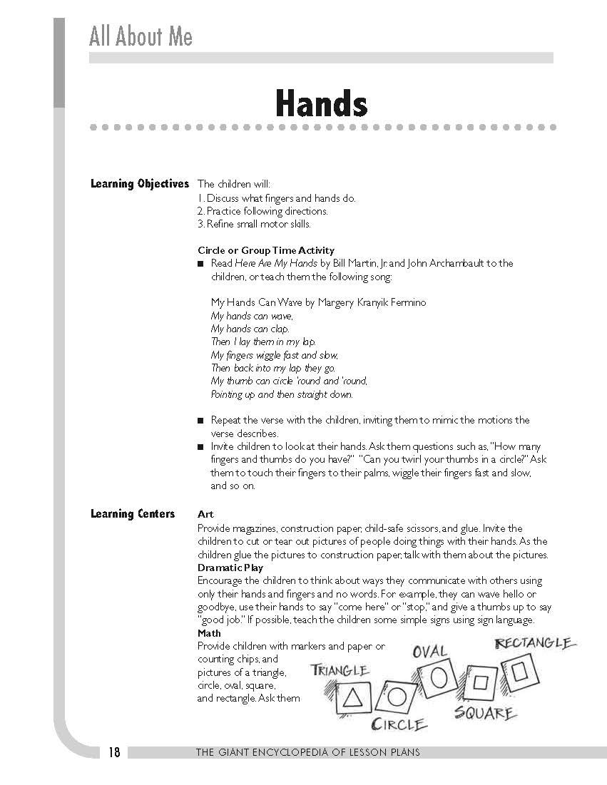Learning Objectives A Circle or Group Time Activity Book Suggestions Snack Ideas Five Learning Center Activities Assessment Strategies Related Songs, Poems, and Fingerplays