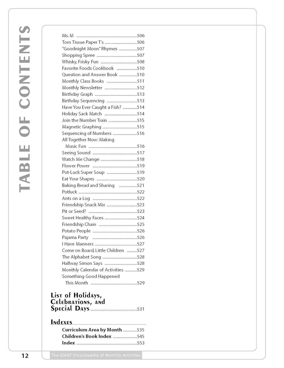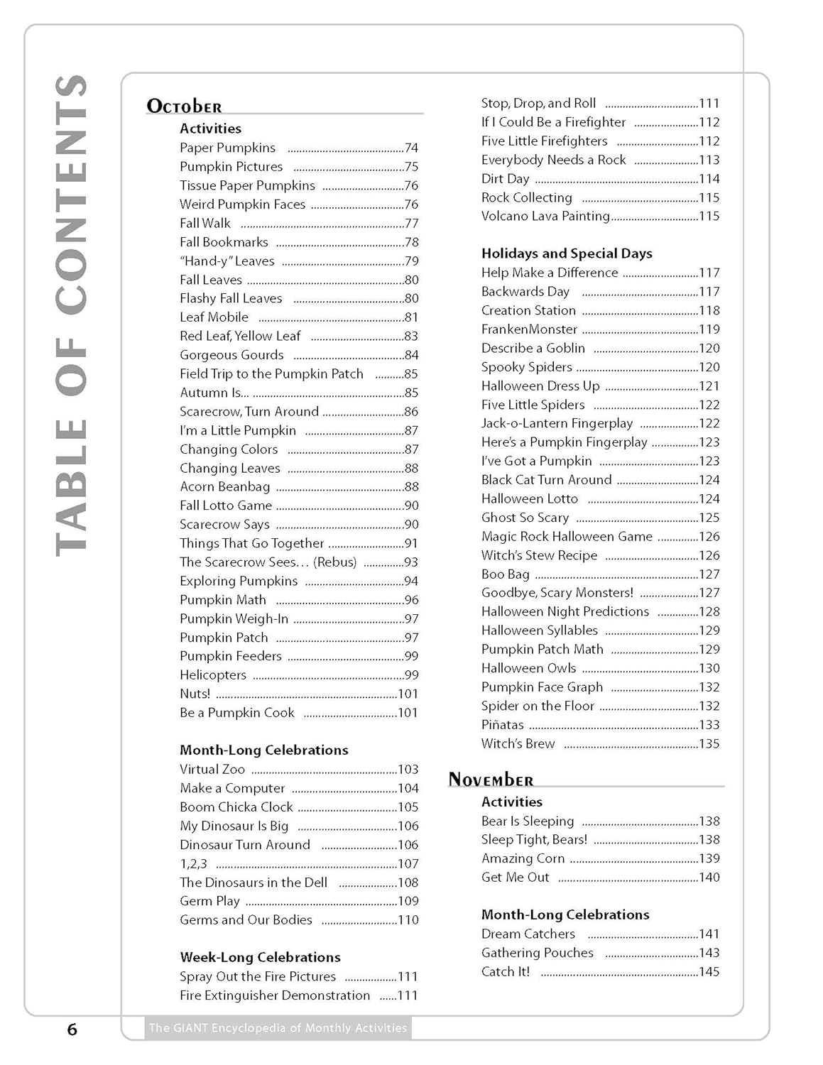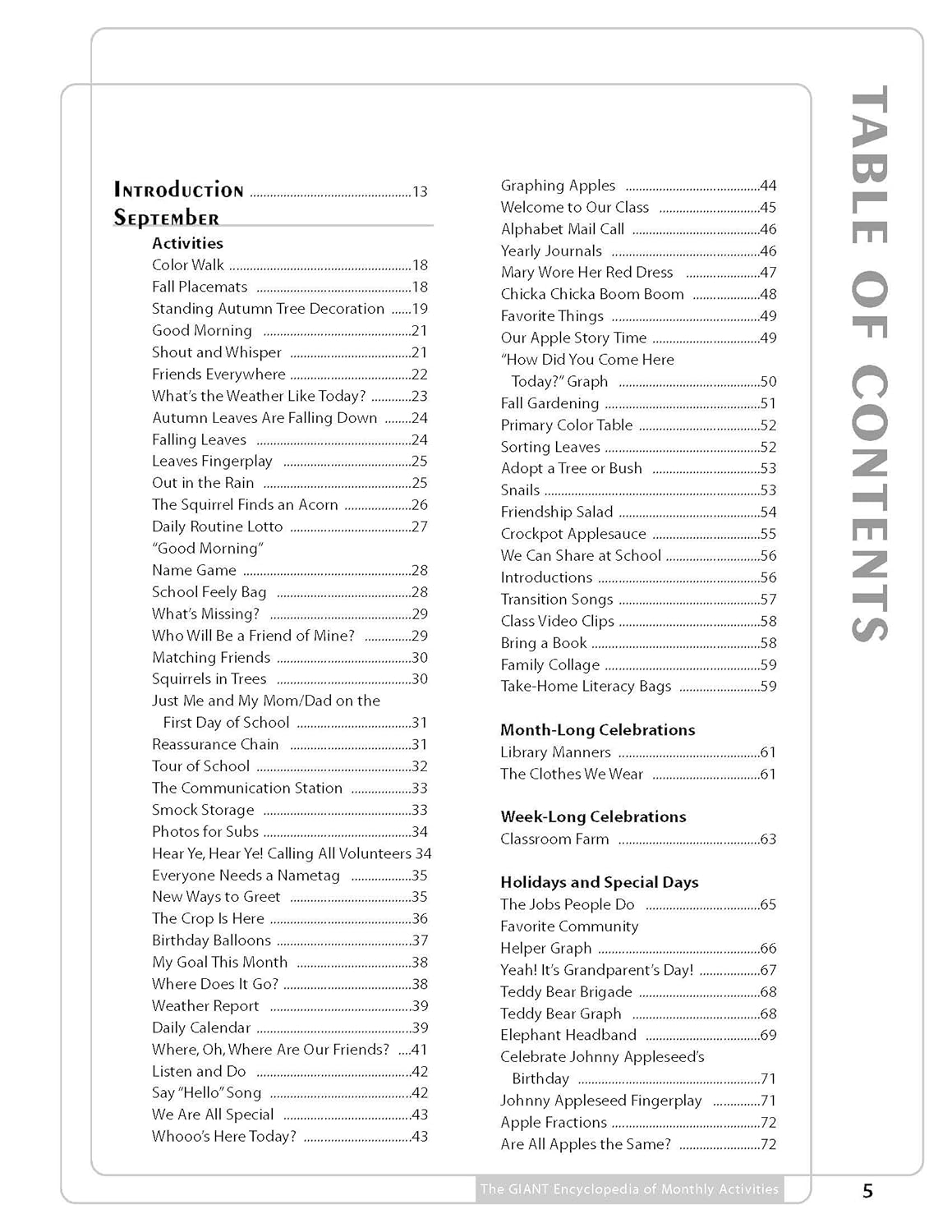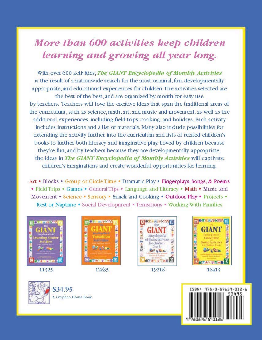 With over 600 activities, The GIANT Encyclopedia of Monthly Activities is the result of a nationwide search for the most unique, fun, developmentally appropriate, and educational experiences for children. The activities included were selected as the best-of-the-best, and are organized by month for easy use by teachers. Teachers will love the creative ideas that span the traditional areas of the curriculum such as science, math, art, and music and movement, as well as the additional experiences including field trips, cooking, and holidays. Each activity includes instructions and a list of materials, plus possibilities for extending the activity further into the curriculum. Many also include lists of related children’s books to further both literacy and imaginative play. Loved by children because they’re fun, and by teachers because they are developmentally appropriate, the ideas in The GIANT Encyclopedia of Monthly Activities will captivate children’s imaginations and create wonderful opportunities for learning.