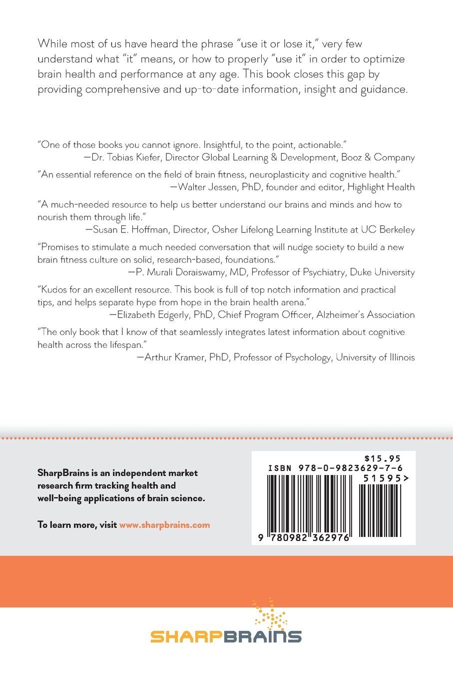 With useful, pragmatic and personalized tips and suggestions that are easy to implement, the SharpBrains Guide offers a groundbreaking new approach for self-assessing current brain fitness needs and identifying the most relevant and evidence-based methods to preserve and enhance brain function throughout life. Whether your goal is to become more resilient, enhance memory, ward off Alzheimer’s disease, or simply improve mental focus to perform better at work, this how-to guide shows you exactly how to “use it or lose it.”