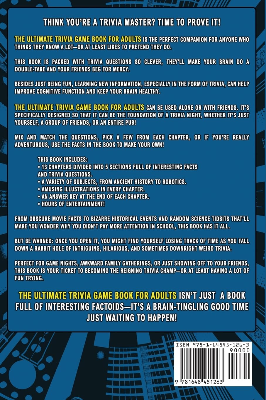 With 975 trivia questions across 13 fun quiz categories such as history, music, food, travel and the world of entertainment to name a few, this trivia book for adults is guaranteed to challenge even the sharpest minds while keeping everyone entertained.