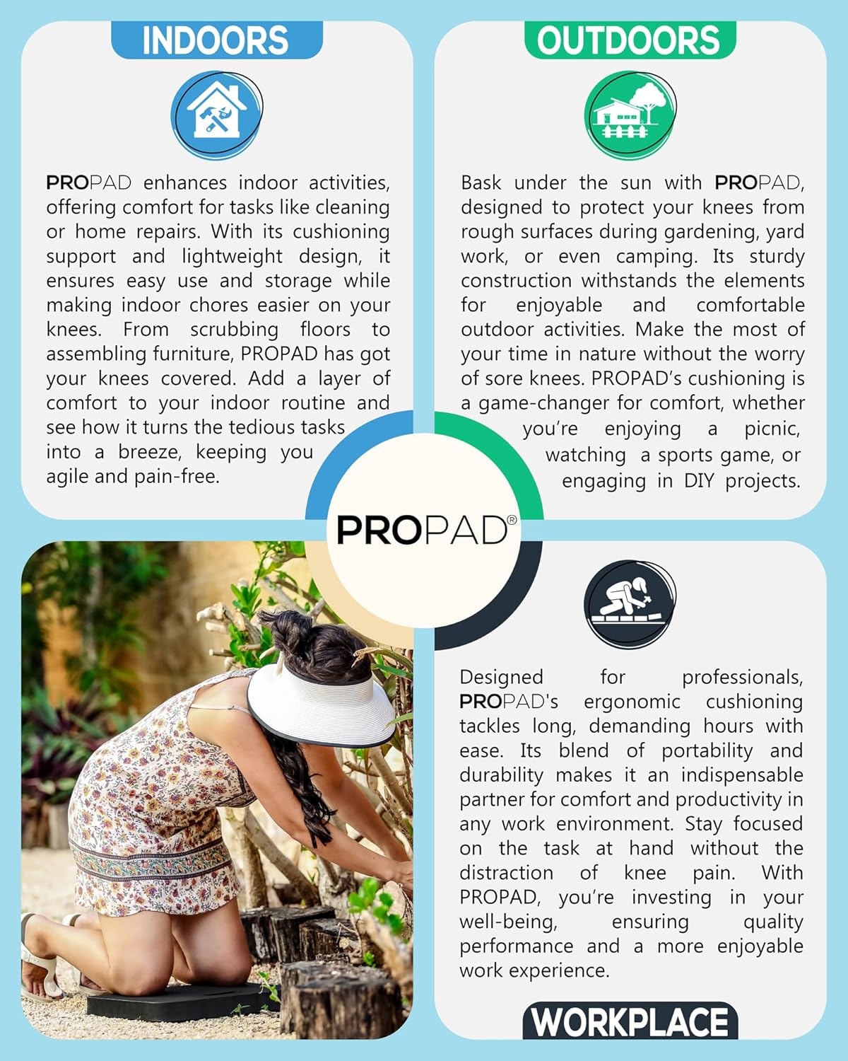 PROPAD is a must-have for avid gardeners. But, not only! This multipurpose pad is also a godsend for parents of toddlers and pet owners, making bath time a breeze, for mechanics, floorers, locksmiths, construction workers, plumbers, carpenters, painters, DIYers and many others. Slide it under your knees, bum or hip for cleaning out low cabinets, changing tires, fixing the fence or something inside the house. Use it even for a game-day stadium seating or while camping with family and friends. So essential, you’ll wonder how you lived without it!