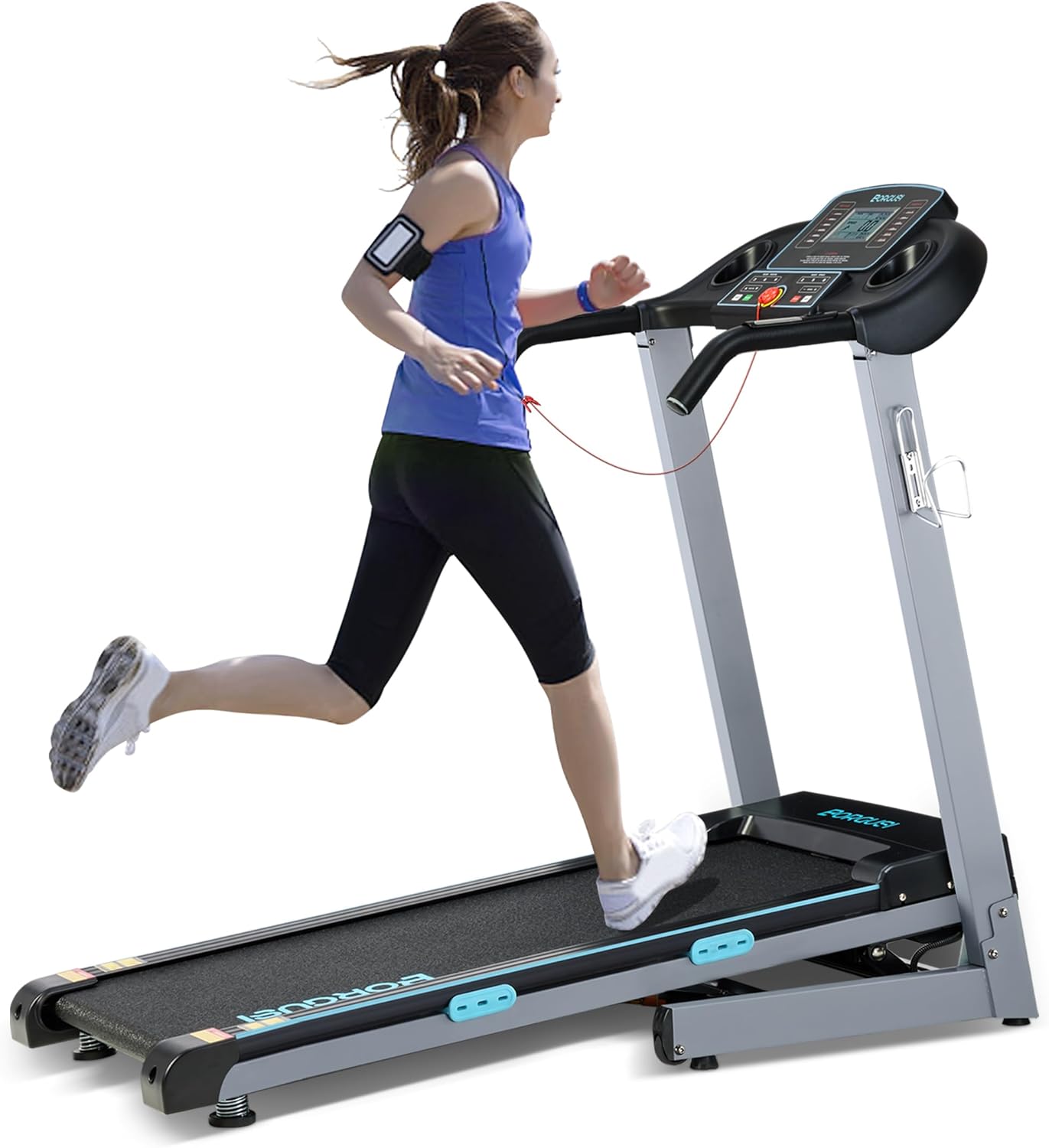 【Widened Double Shock-Absorbing Deck】BORGUSI 43.5″ x 17.5″ large running track to fit different users‘ stride lengths. The stability of the double deck running surface benefits from the integrated shock absorption system, the double deck technology cushions your footfalls with each step. BORGUSI treadmill is designed to accommodate users of most body types with a weight capacity of 300 lbs.