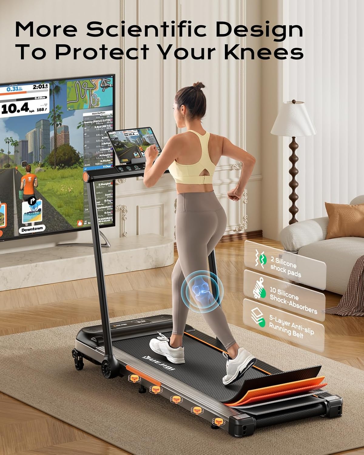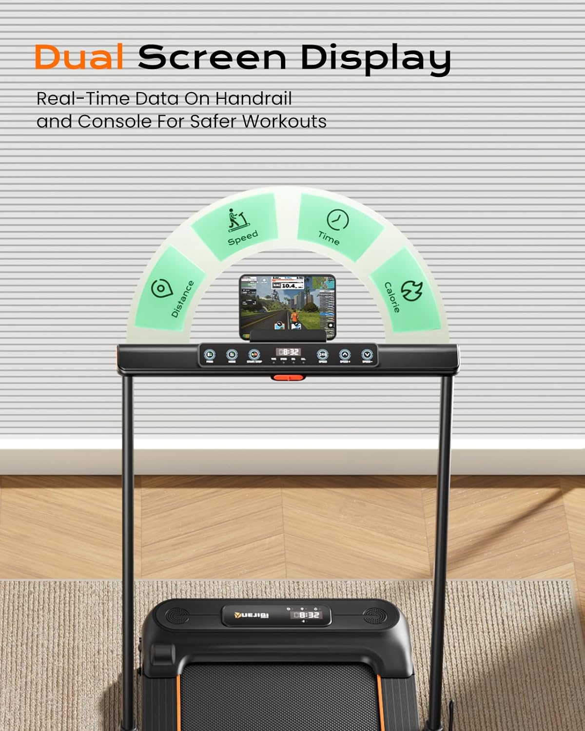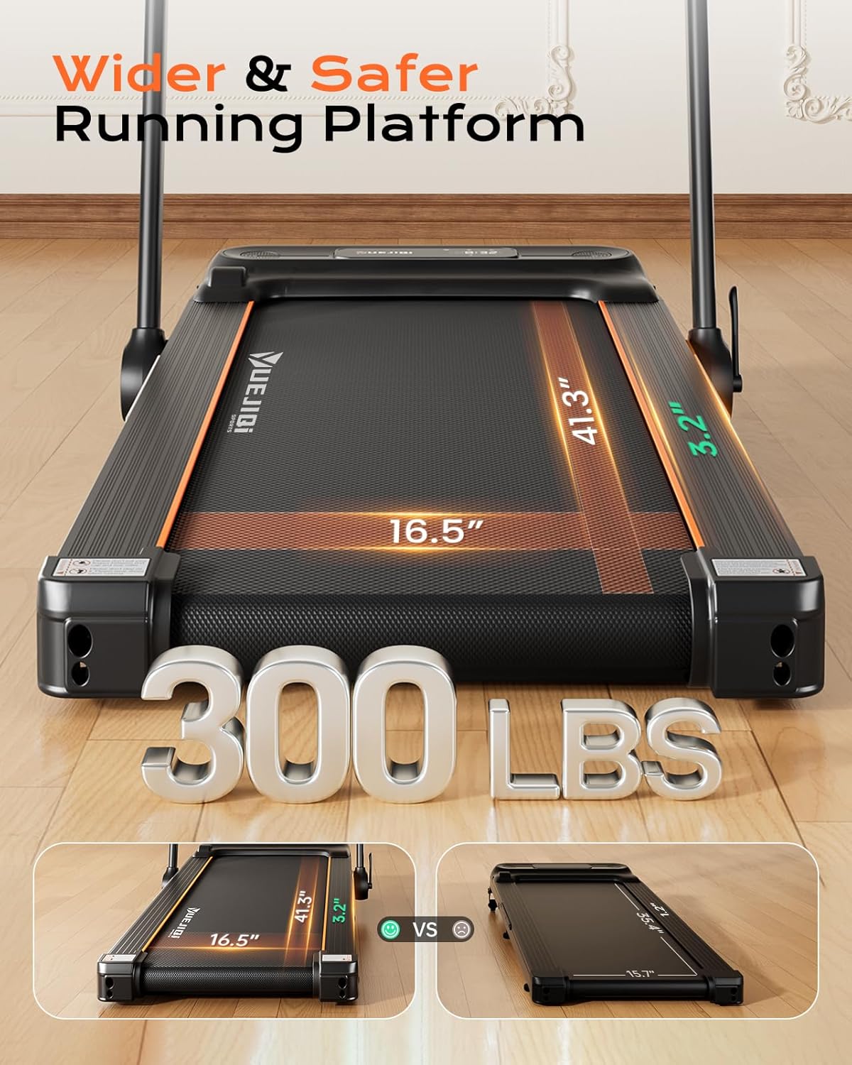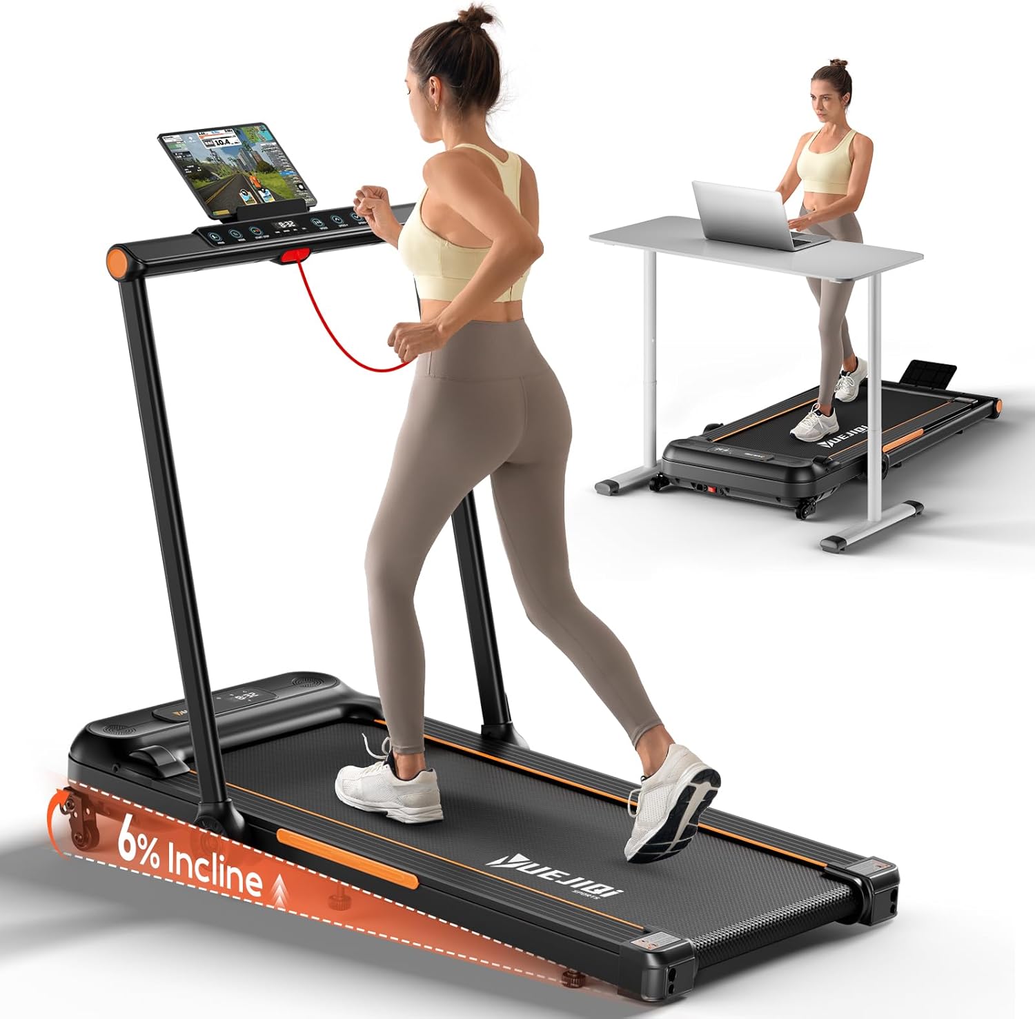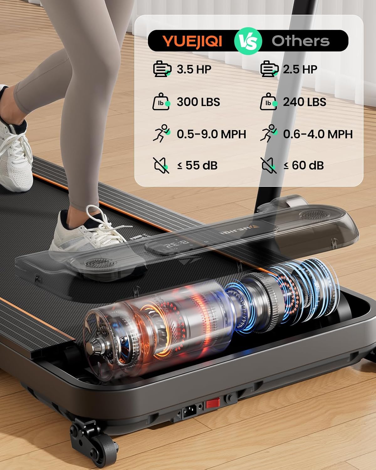 TREADMILL WITH INCLINE: Compared to standard walking pad with handle bar, the YUEJIQI portable treadmill with 2 levels manual incline can be adjusted to 6% incline, delivering an authentic outdoor exercise experience. Specifically designed to sculpt the contours of your hips and legs, it boosts fitness and fat-burning effects by up to 60%