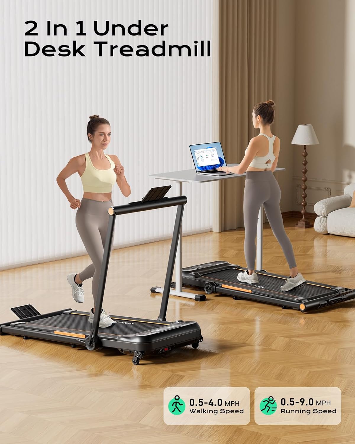 2-IN-1 FOLDING TREADMILL: Compared to ordinary under desk treadmill, YUEJIQI 2-in-1 walking pad has 2 modes to meet your different sports needs. When the handrail is folded, it can be used as a jogging machine at a speed of 0.5 MPH-4.0 MPH; when the handrail is raised, it can be used as a running treadmill at a speed of 0.5 MPH-9.0 MPH. And equipped with a remote control with a one-key start, easy to adjust
