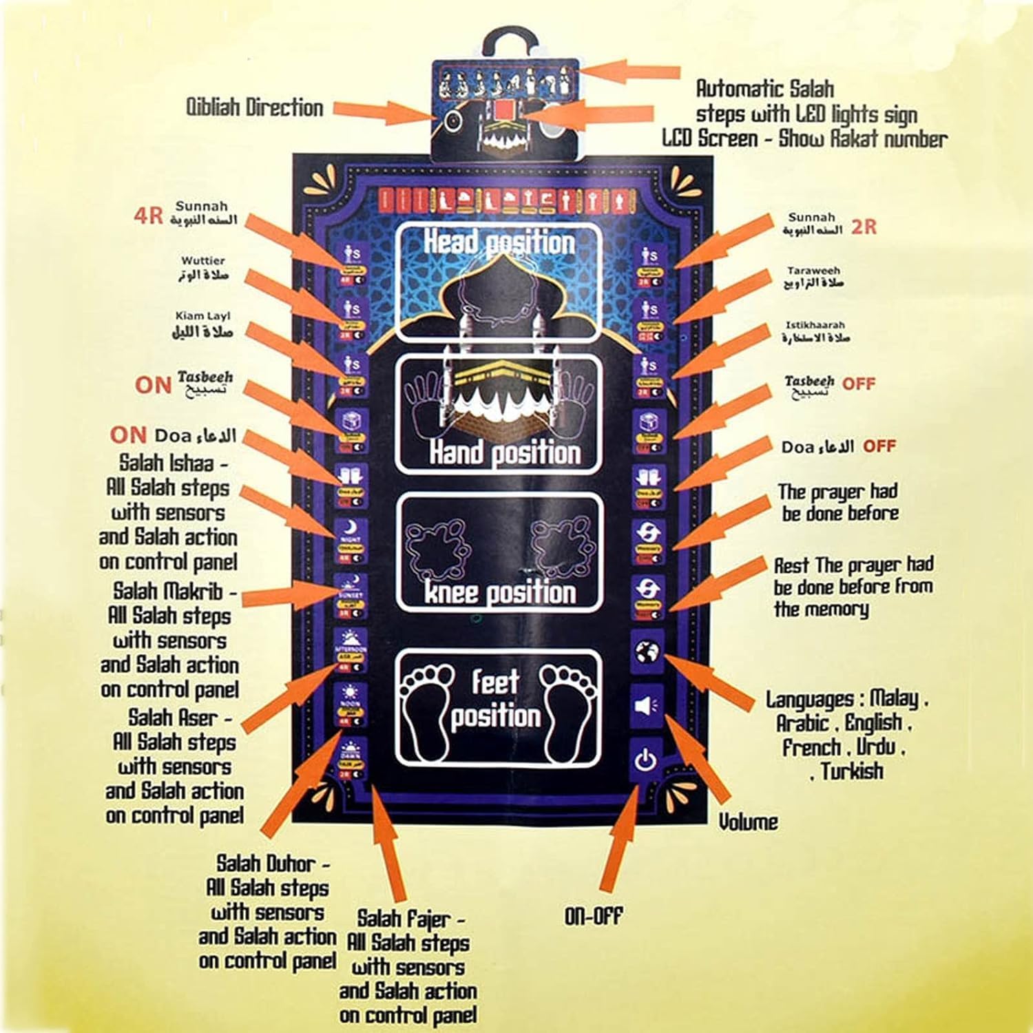 The interactive prayer rug is touch sensitive and has pre-stored buttons that can be touched to display sounds such as prayer times, how to perform a small cleansing, recite the Koran, say dua, etc. [6 different languages] Pray each prayer with one click, simply select the prayer you want to pray, and once you have selected the prayer, it will not begin until you get up. All prayer is guided by the illumination of the various prayer postures at the right time. Indicates to the praying people the postures they need to take at a certain time. This intelligent Islamic interactive Muslim prayer mat teaches children to pray. Worship Steps Teaching Mat] The mat accurately records the content of the service and the standard movement songs to teach children to pray. Foldable and Portable] Beaded cotton fabric with smooth surface, easy to clean and comfortable to be