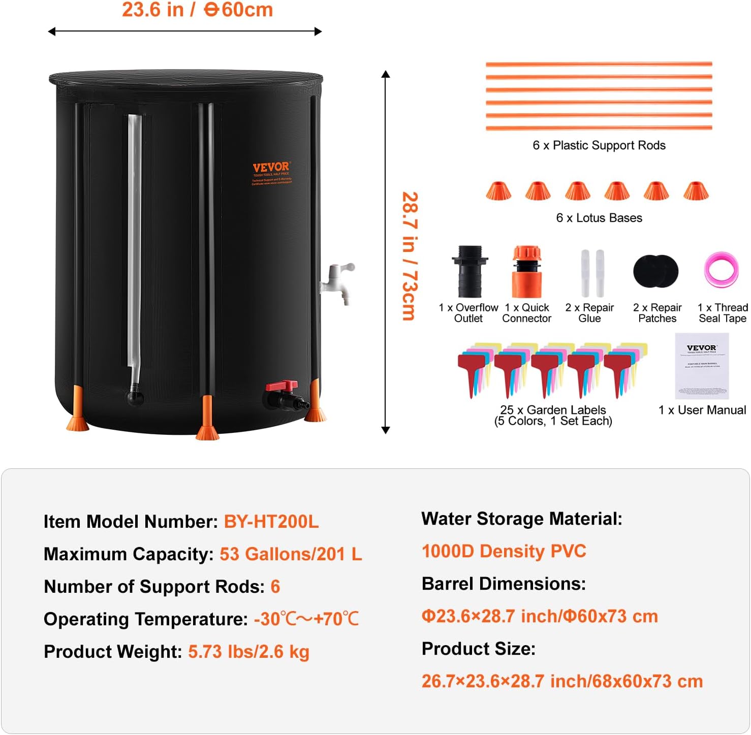10 reviews for VEVOR Collapsible Rain Barrel, 53 Gallon/201 L Portable Rain Water Collection Barrel, PVC Rainwater Collection System with Spigots and Overflow Kit, Water Barrel for Garden Water Catcher