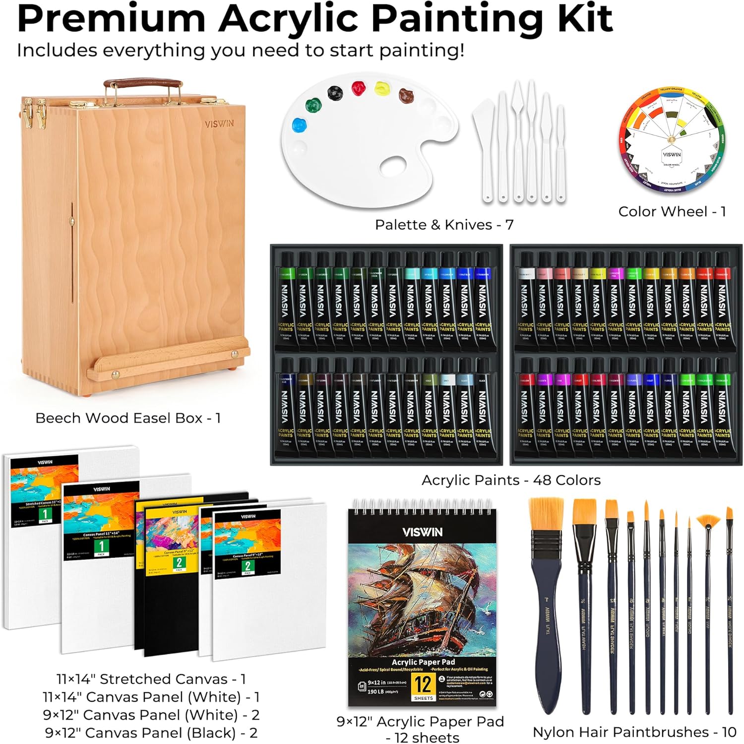 VISWIN Deluxe Acrylic Paint Set, 74 Pcs Complete Art Supplies with Tabletop Sketch Box Easel, 48 Colors Acrylic Paints, Canvas, Paint Brushes, Painting Kit for Adults, Art Set for Artists, Beginners