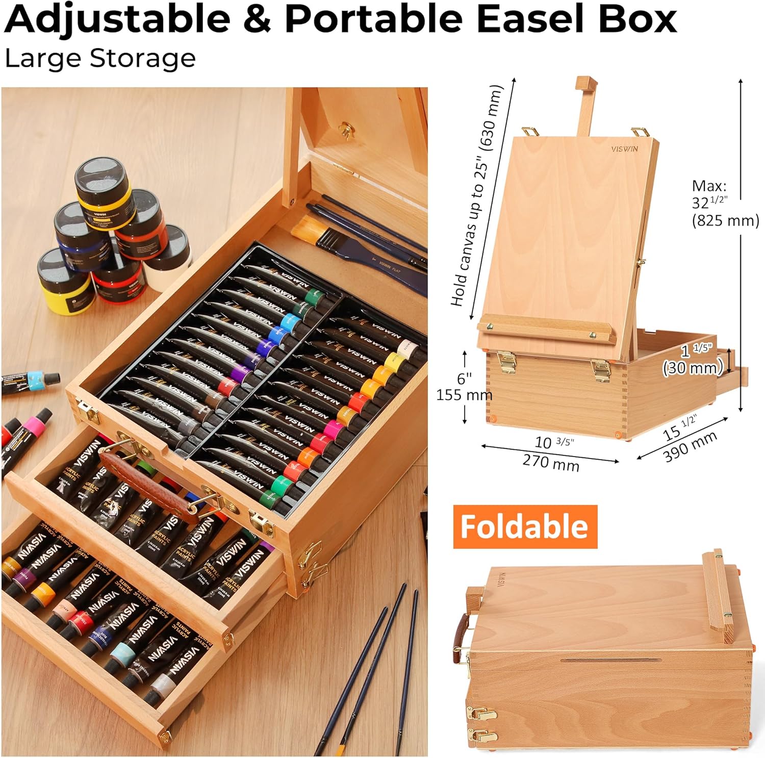 [Portable Large Storage Box] With 2 drawers and one storage box, you can keep painting supplies inside and take to anywhere. The lightweight design will not bring trouble to your travel. This art easel box is made of solid German Beechwood, sturdy and durable. Adjustable and high-quality, the tabletop easel is perfect for artists, Plein-air painters, students, adults.