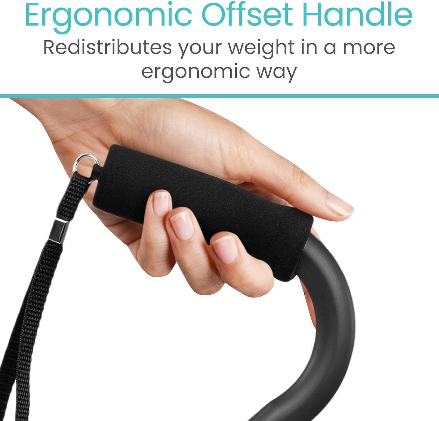 OPTIMAL WEIGHT DISTRIBUTION AND ENHANCED WRIST SUPPORT: Ergonomically designed offset handle centers your weight over the cane’s base, providing impeccable balance and unwavering support. Offset grip reduces hand strain and fatigue for maximum comfort.