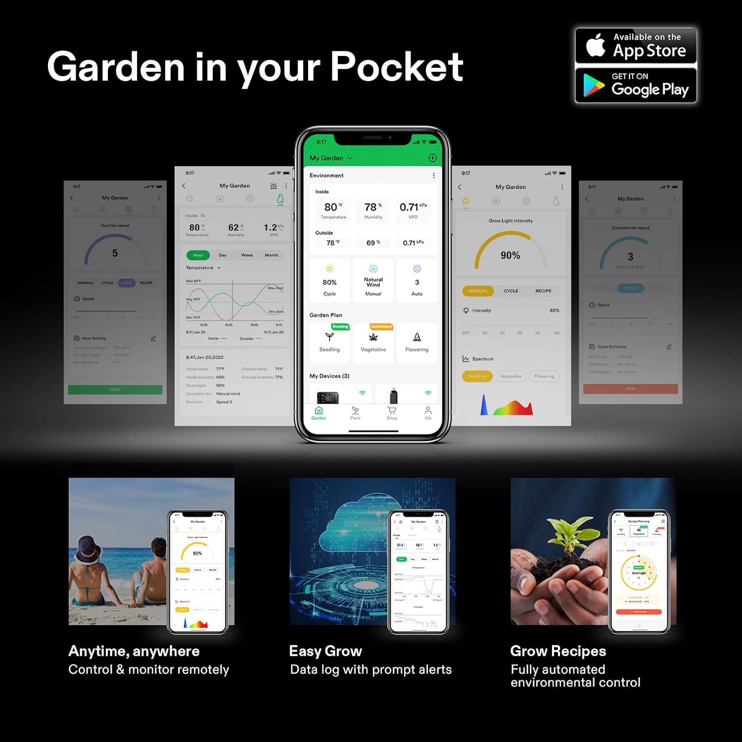 Smart Grow with GrowHub E42A: With a built-in temp and humidity gauge and one probe, the GrowHub E42A Controller monitors changes in both the internal and external environment including VPD; WiFi connectivity and app control allow you to access real-time data and remotely manage equipment from anywhere