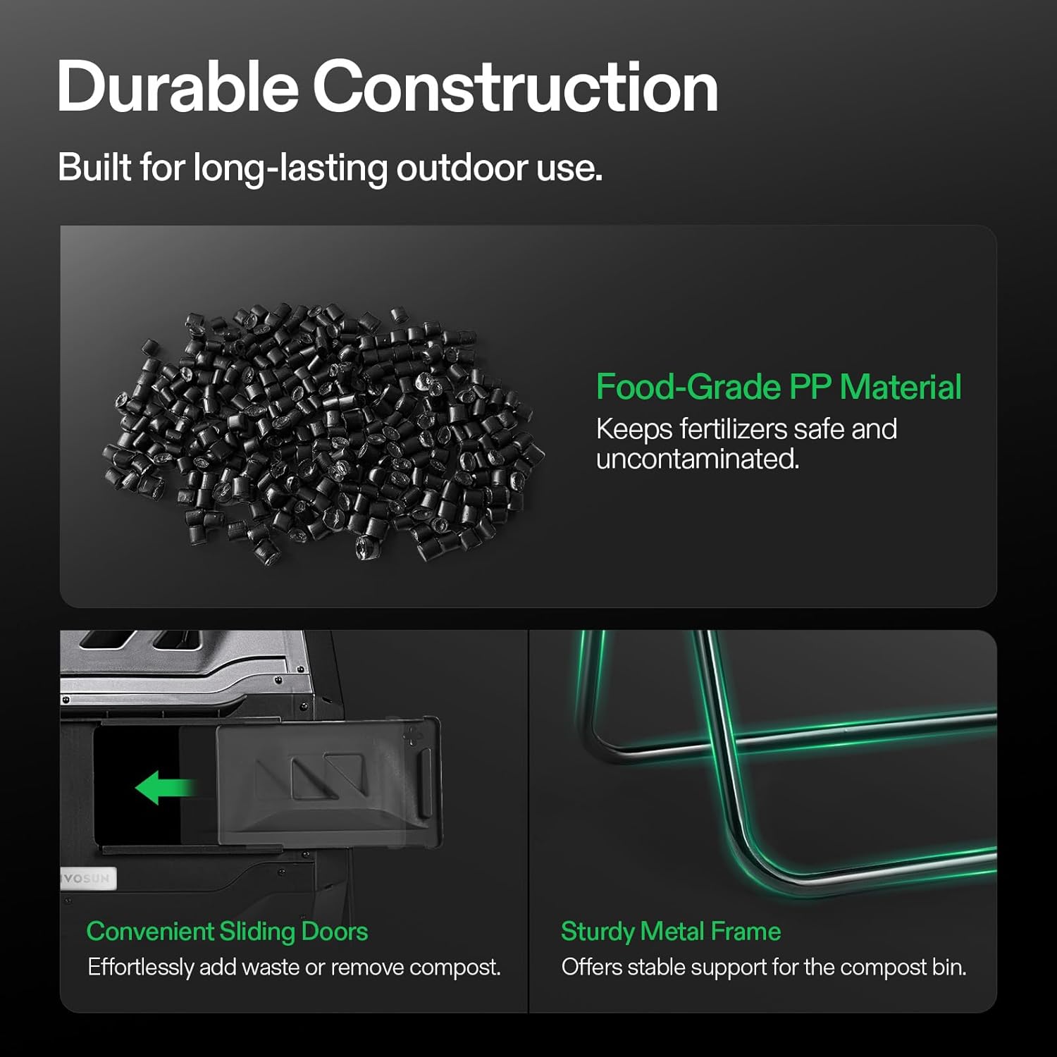 Sturdy & Durable Construction: Constructed of premium metal frame and high-quality pp plastic body, this tumbling composter is corrosion-resistant, weathering-resistant, sturdy, and durable for long-lasting service life