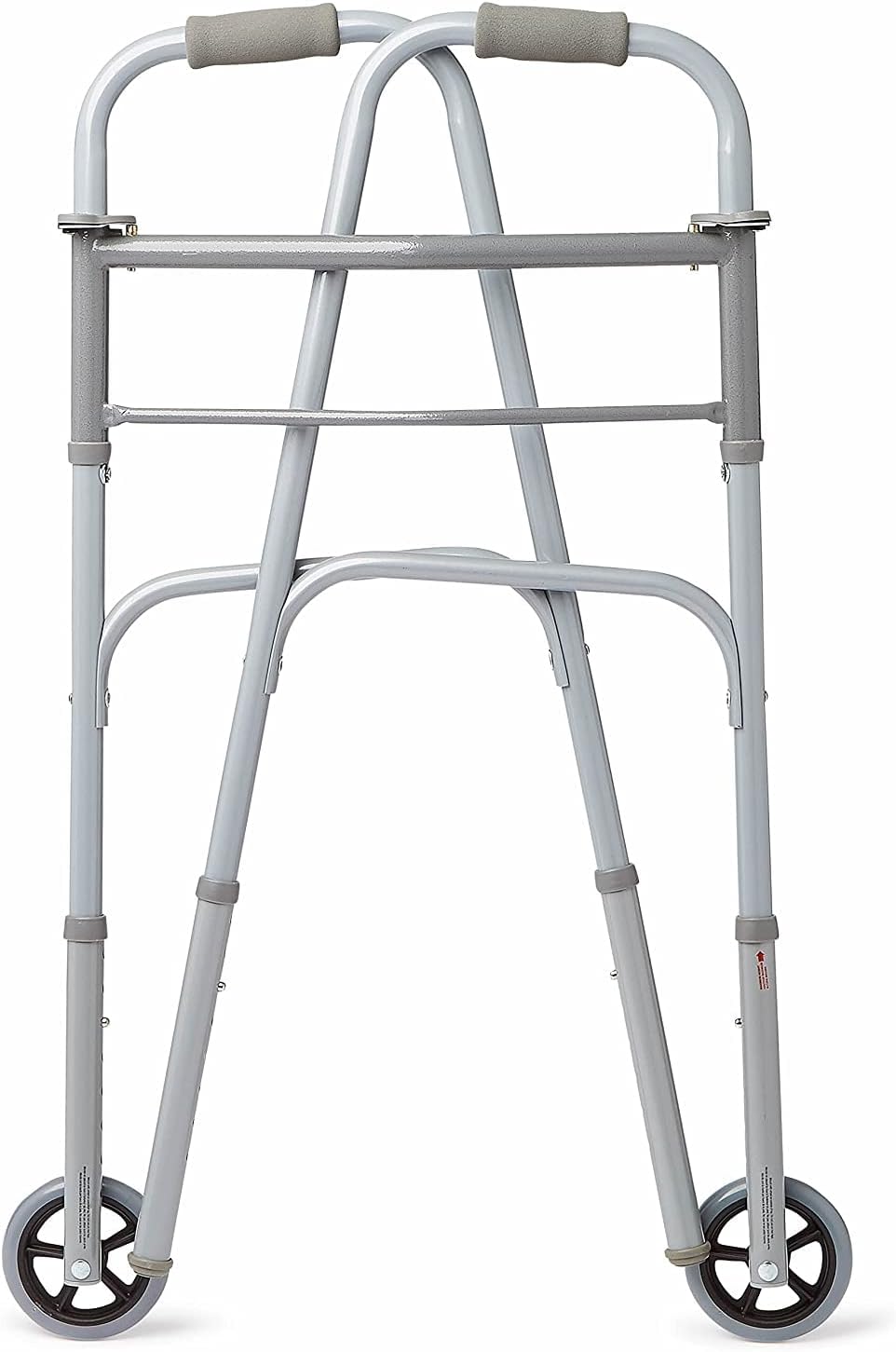 Walker Folding Deluxe 2 Button with Front 5″ Wheels and Additional 2 Pair Free Rear Glides for, Adjustable Height (Short, Standard, Tall People) by Healthline Trading
