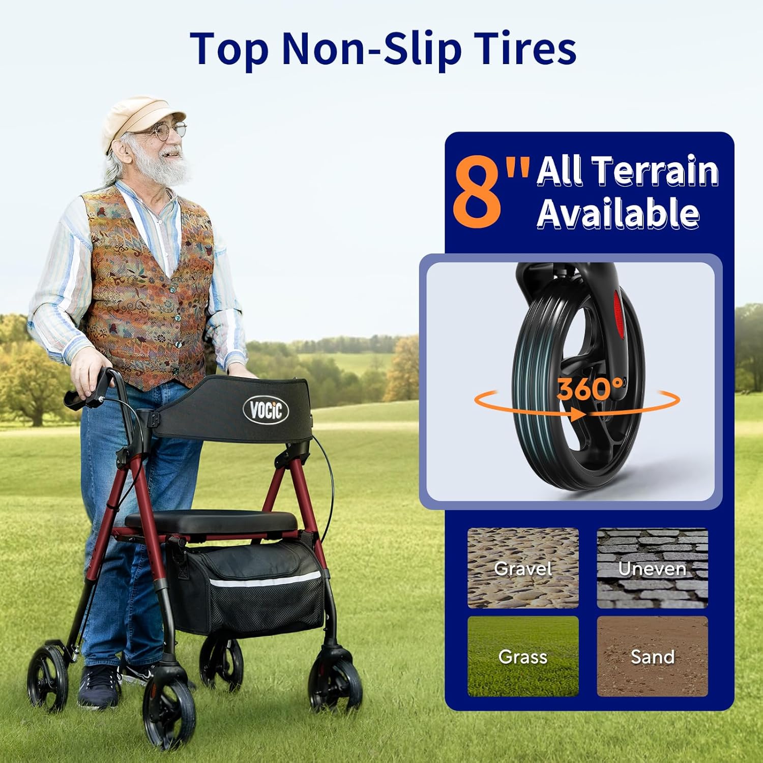 【For All Terrain】The Rolling Walker is equipped with premium puncture-proof tires, providing excellent durability and allowing it to handle bumps and various terrains easily. Its 8″ big wheels enhance obstacle-crossing capabilities, standing out from the common 6″ ones in the market. The upgraded textured tire surface boosts outstanding slip resistance, enabling stable walking even on slippery surfaces. Plus, the 360° rotating front wheels make navigation effortless.