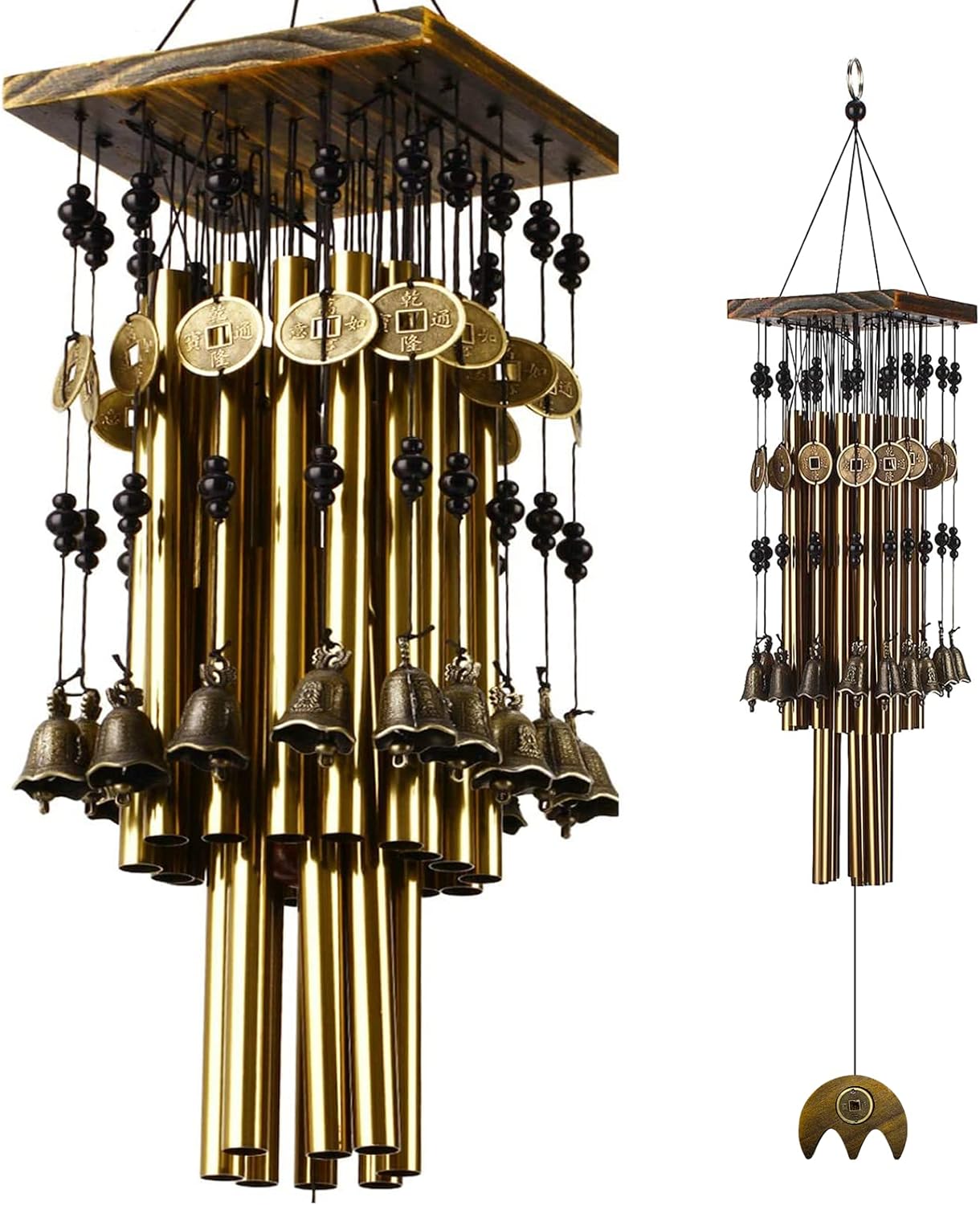 Wind Chimes Unique Design: wind chimes for outside unique are made of pine and 24 Windbell tube,outer ring 16 piece,inner ring 8 piece,top of the windbell top is a solid wood square plate. under the windbell is copper cash pendant.and the wood is made of wear resistant and noncracking pine.Each metal tube has its own unique tone when it collides provides a beautiful and harmonious sound, and brings a clear and pleasant ring anywhere.