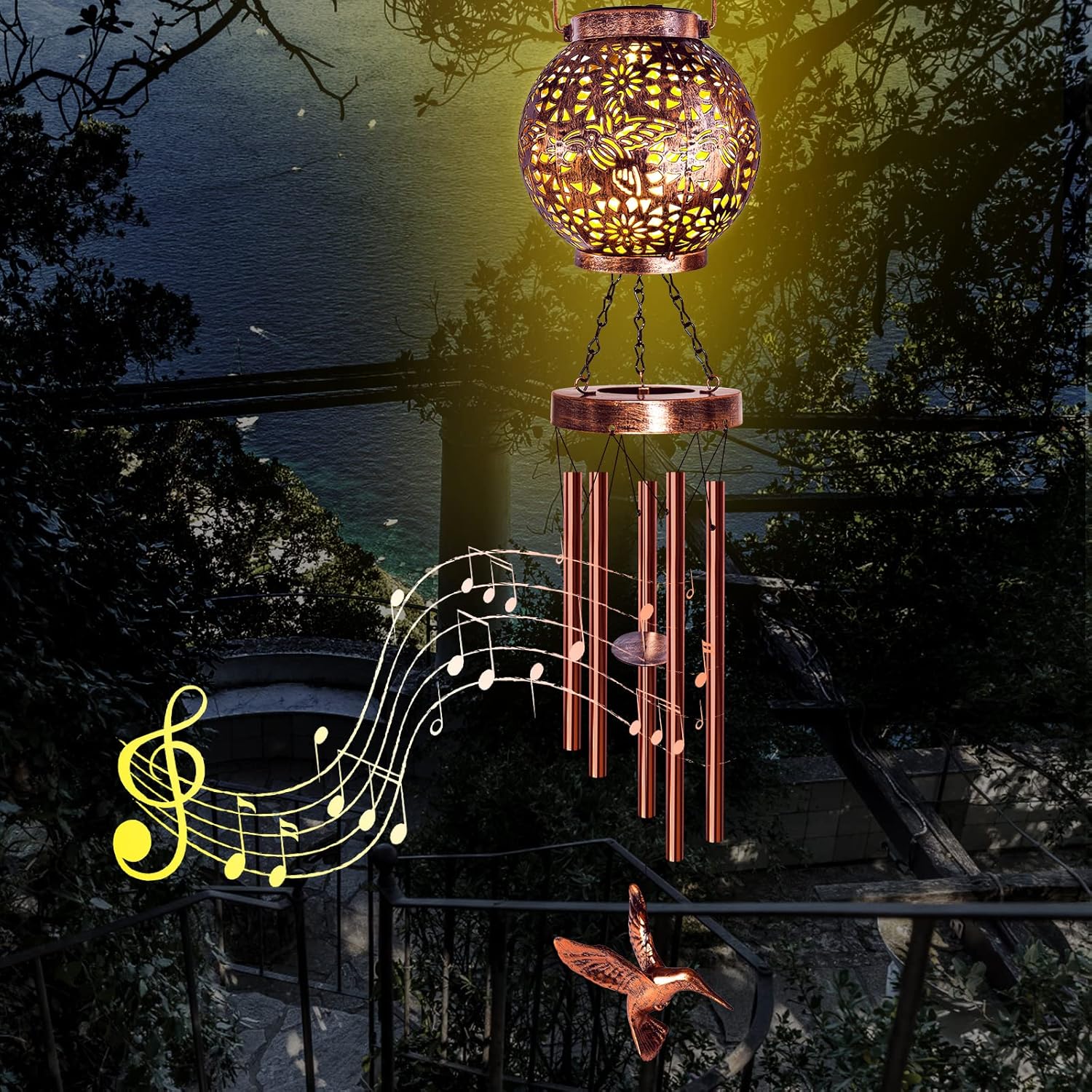Deep Tone: The solar wind chimes for outside are designed with 5 different length tubes, each metal tube has its own unique tone when it collides, creating a soft and soothing melody; listen to music in the gentle wind makes you relaxed