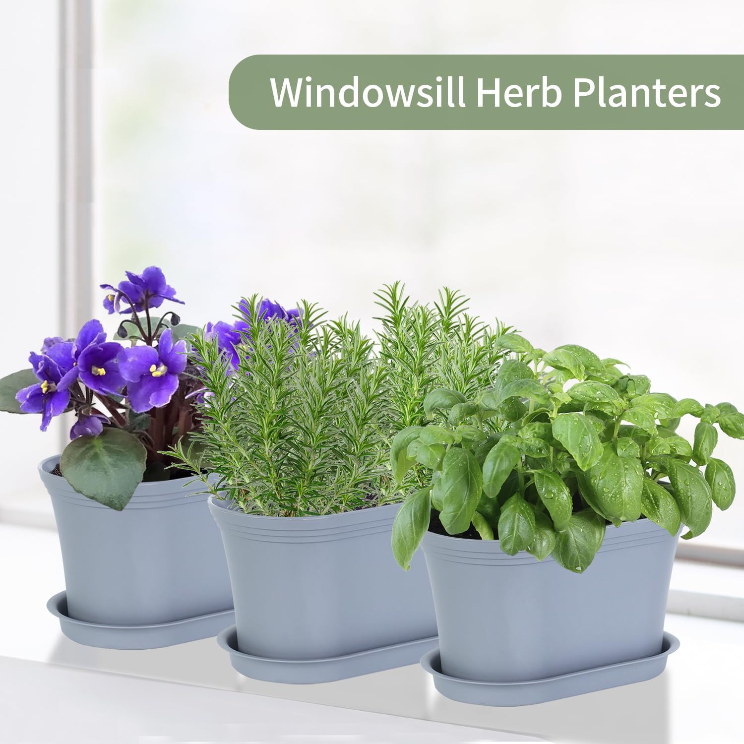 Windowsill Herb Garden Planter with Tray, Set of 6 Grey Oval Farmhouse Garden Pots for Indoor/Outdoor Plants (No Seeds)