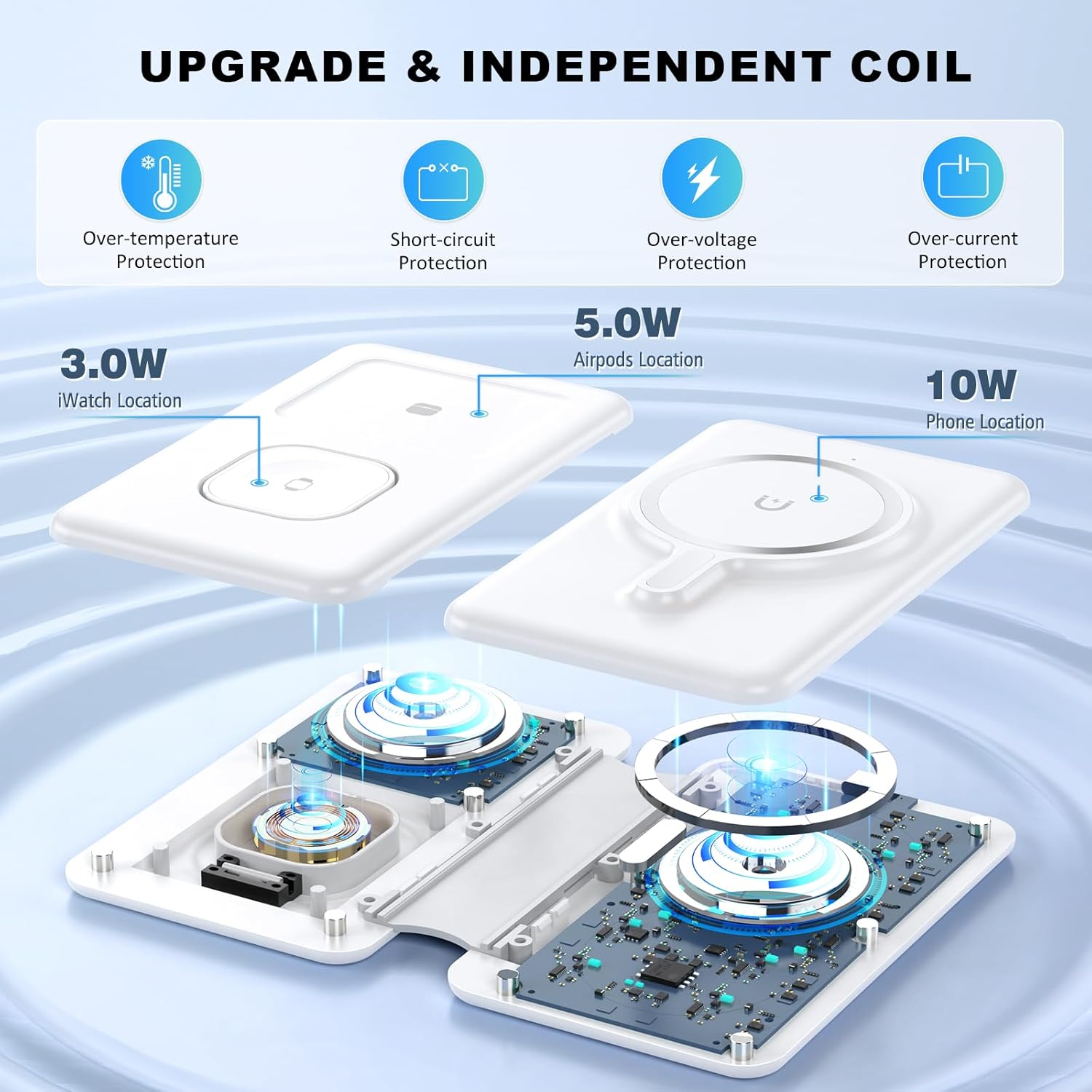 Fast Charging: This product features high-quality strong magnets that ensure easy alignment with the wireless charging coil of the smartphone, resulting in a fast and stable charging experience.Our charger station adopts intelligent protection technology to provide temperature control, overvoltage protection, short circuit protection, overcurrent protection to ensure safe and fast charging.