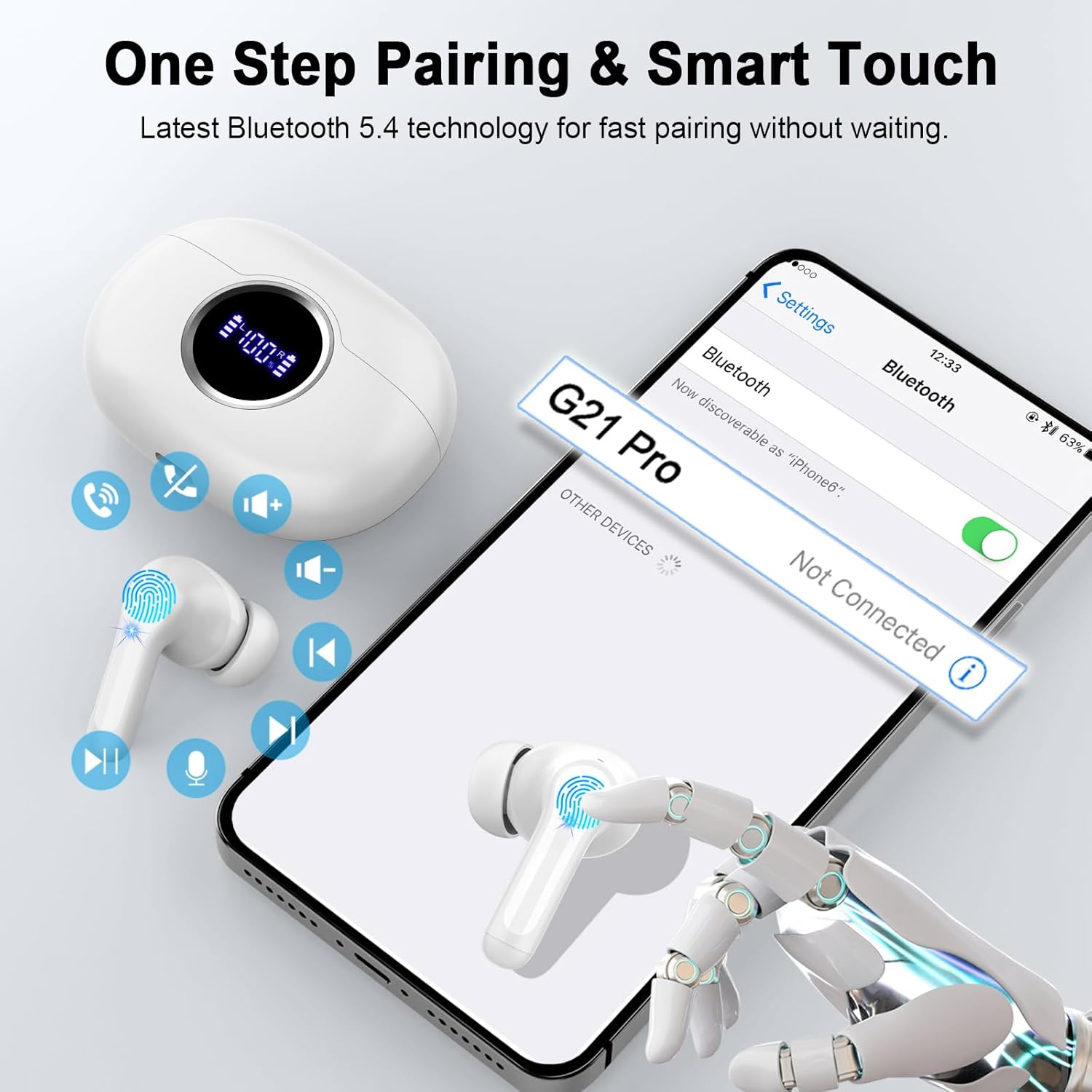 2025 Upgraded Bluetooth 5.4 with 0.1s Ultra-Low Latency: The Rinsmola G21Pro Bluetooth headphones adds Bluetooth flash pairing technology to the latest Bluetooth version 5.4 for fast pairing in seconds. Compared to the previous version, power consumption is reduced by 30%, signal stability is improved by 35% and interference immunity is increased by 45%. Ensure audio and playback are synchronized for an immersive entertainment experience. After the first pairing, Bluetooth will automatically connect to the G21Pro ear bud once the charging case cover is opened.