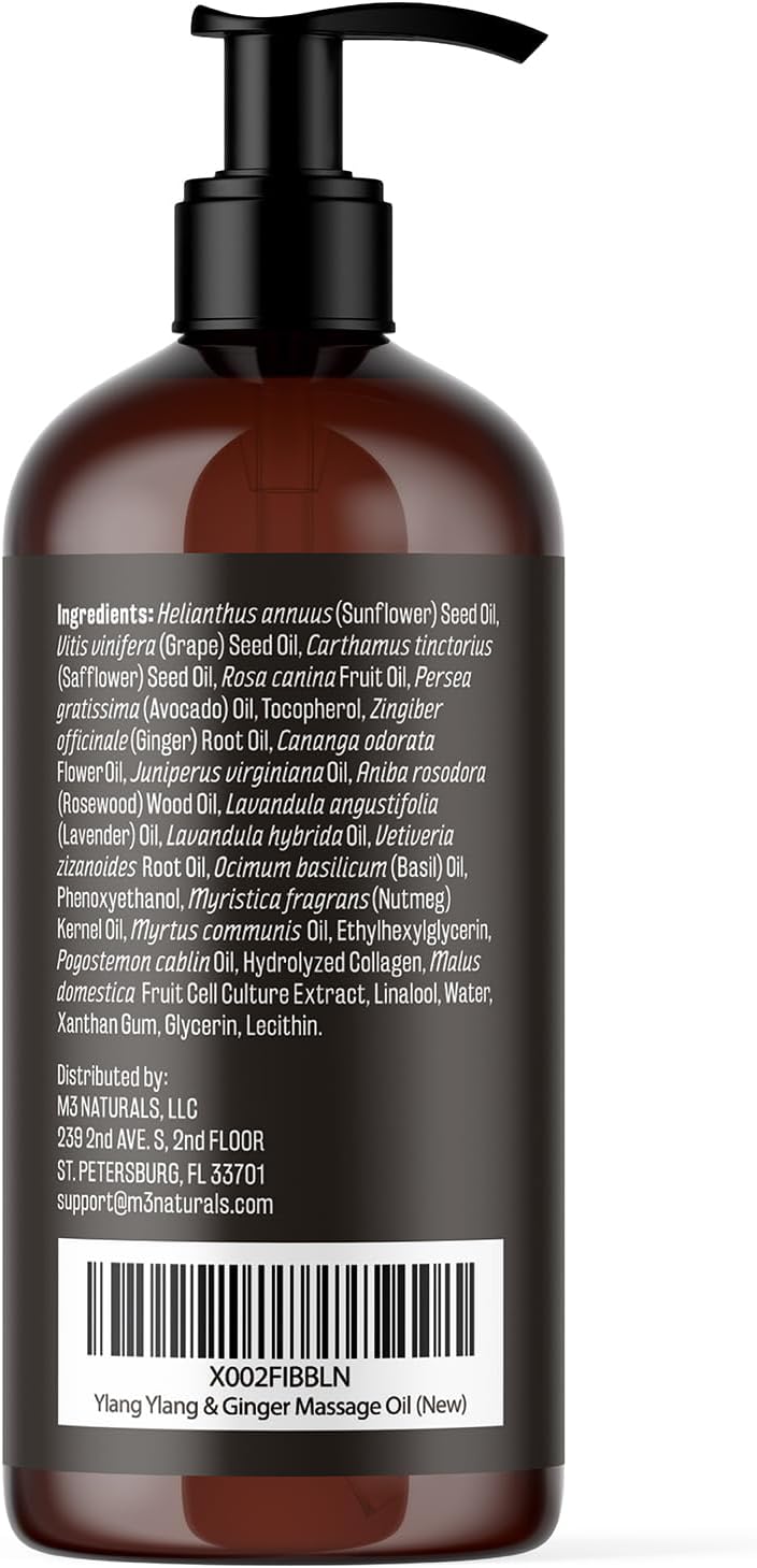 Ylang Ylang + Ginger Massage Oil for Massage Therapy and Manipulation Therapy | Collagen and Stem Cell Anti Cellulite Body Oil for Lymphatic Massage and Sore Muscles Skincare by M3 Naturals