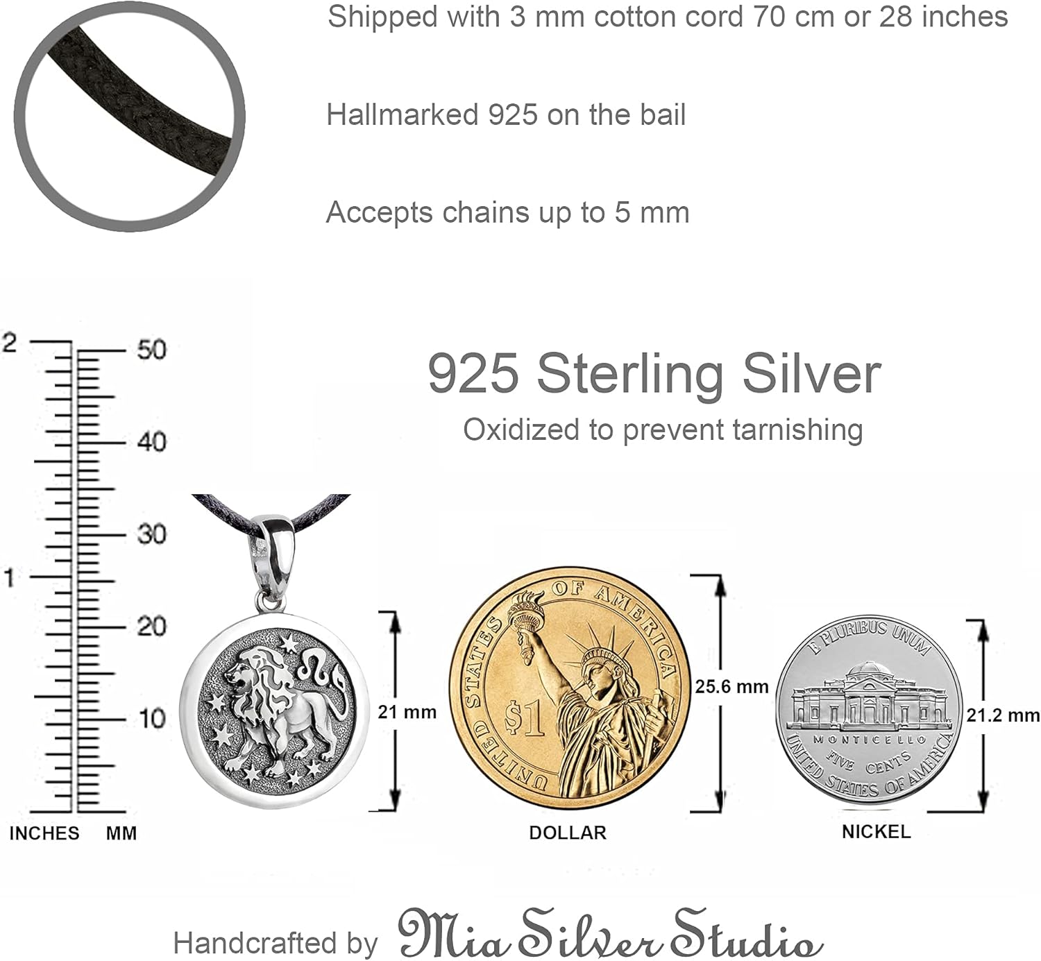 I just wanted a sweet little round pendant. They are very popular right now. As, my zodiac sign is Leo, I purchased that, but it could have easily been something else. I am attaching a close up of the charm and a close up of the charm sandwiched between a nickel and a dime, to show the size is between the two. My closest guess when measuring it is 13/16″, so just a bit over 3/4ths of an inch. I bought the chain separately, and I am glad I did. The reviews saying the cord is a piece of junk are true. I threw it away. I love my new necklace though.
